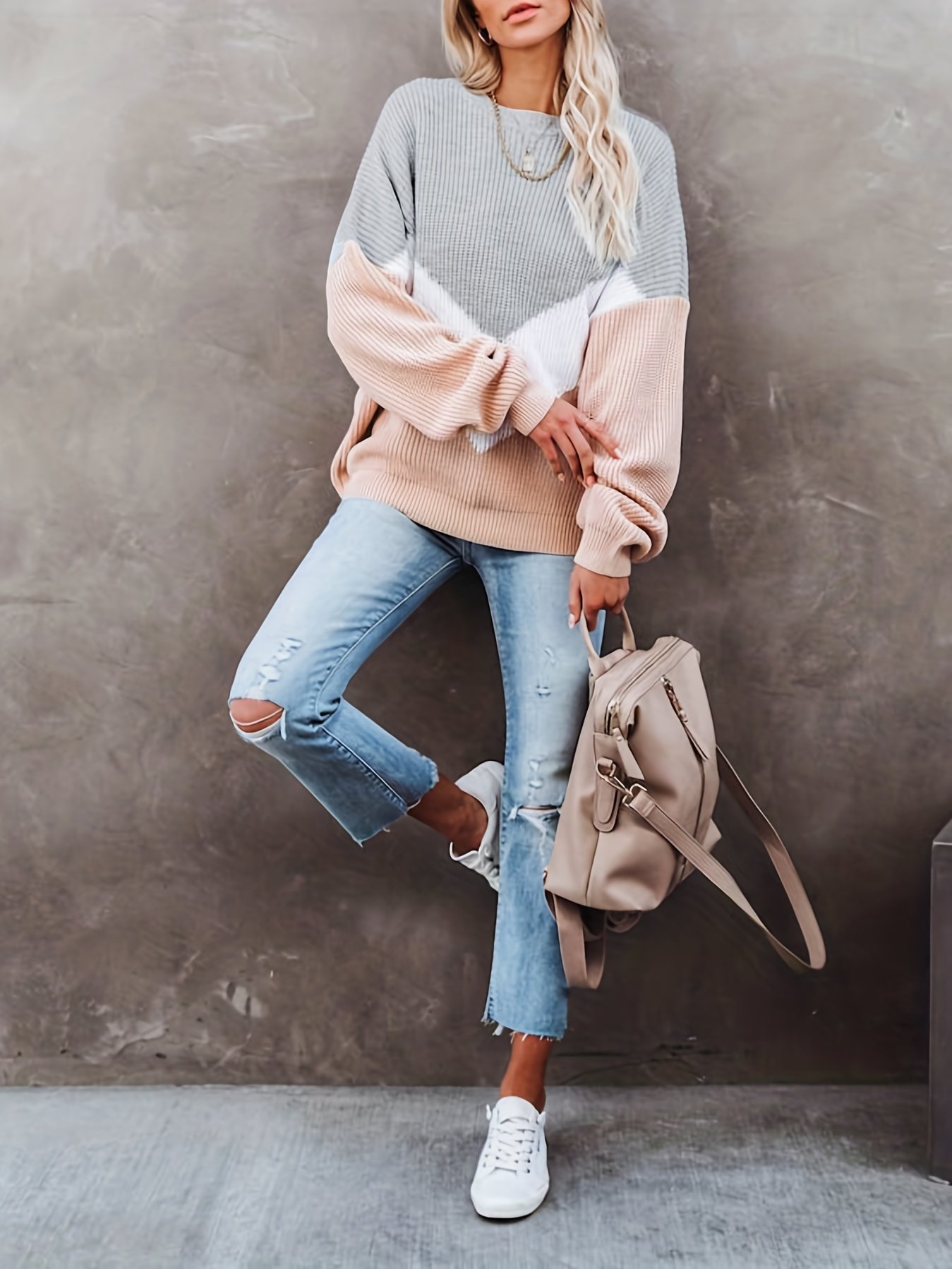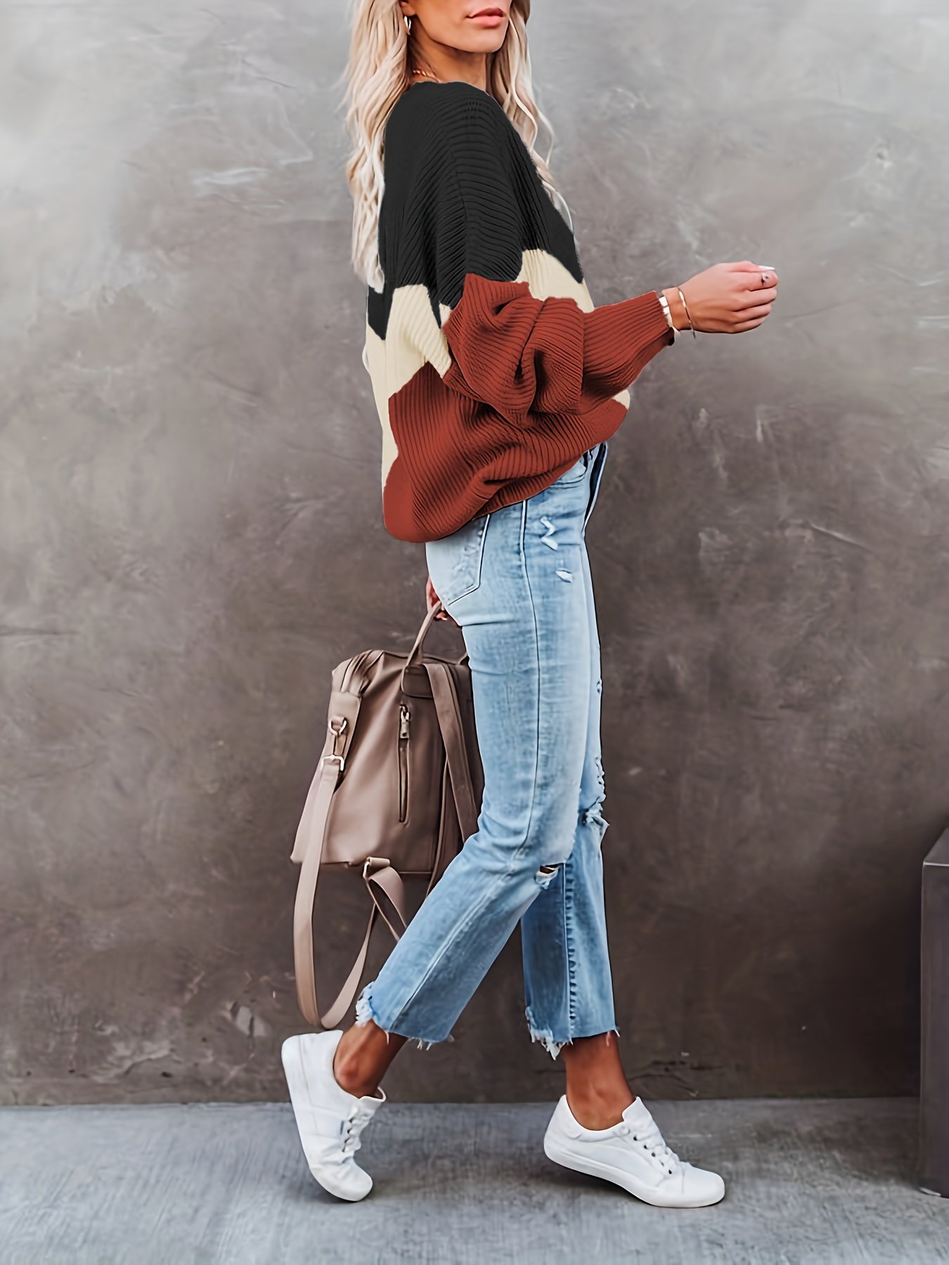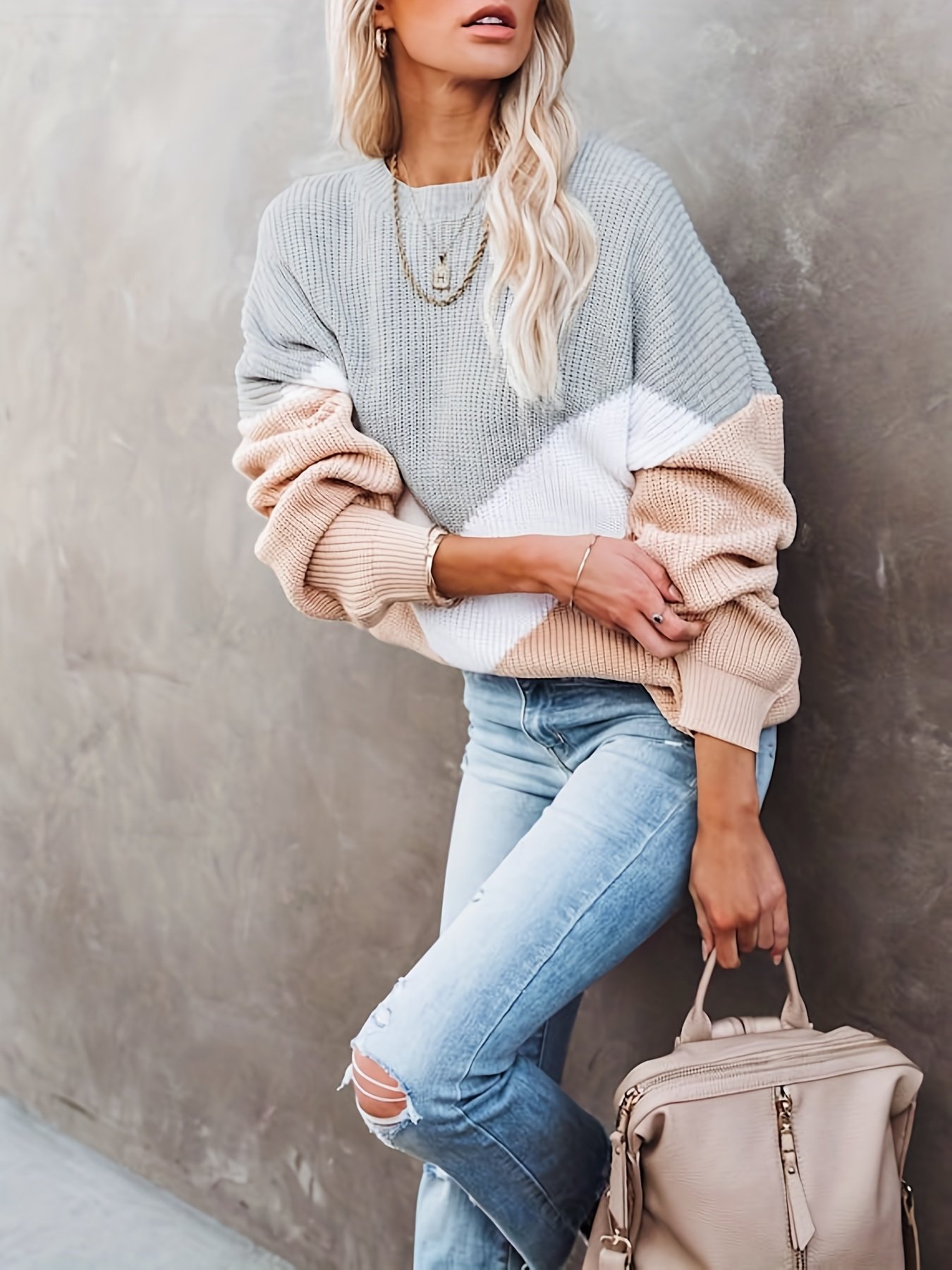 Color Block Crew Neck Pullover Sweater, Casual Long Sleeve Sweater For Fall & Winter, Women’s Clothing