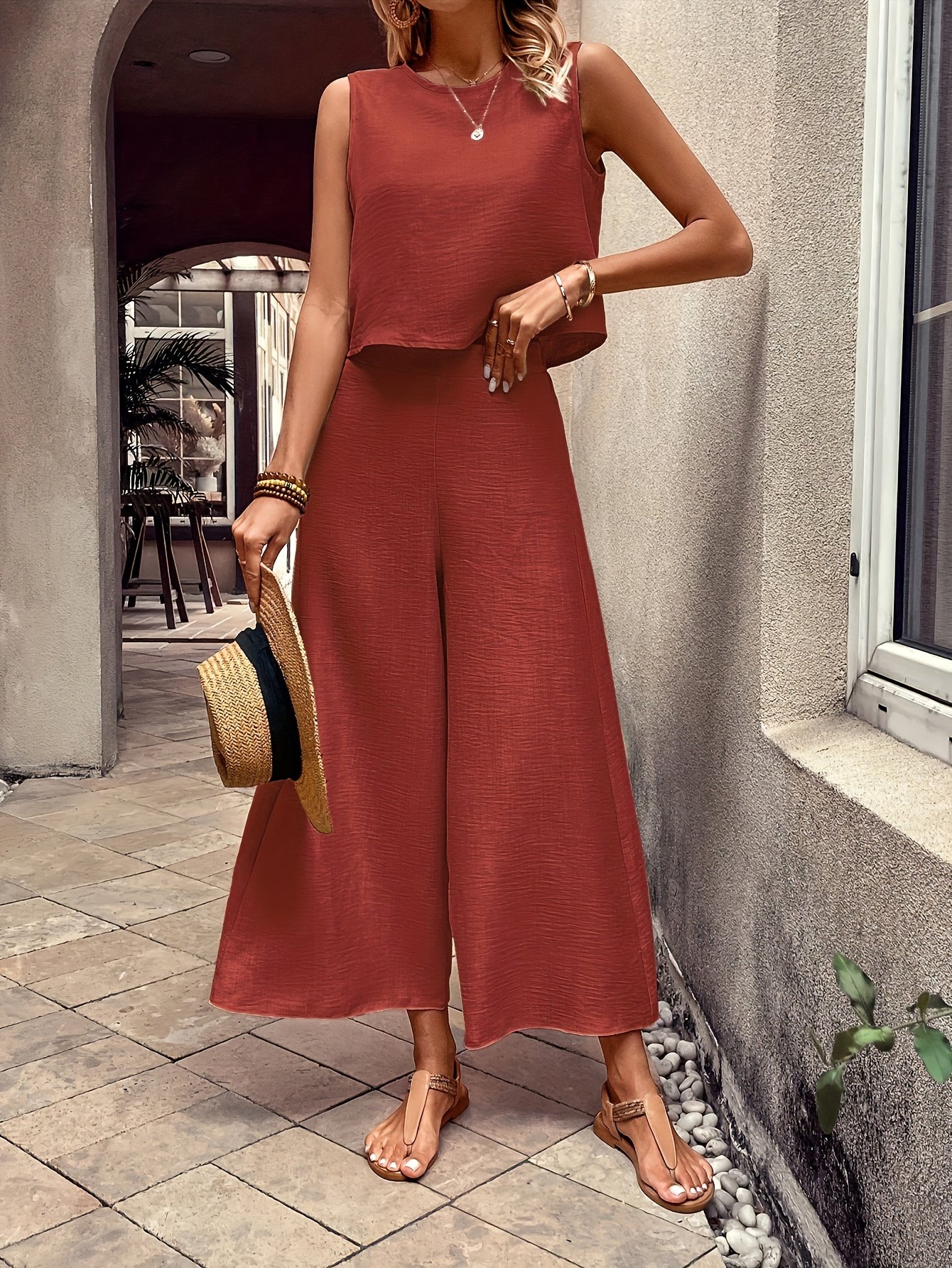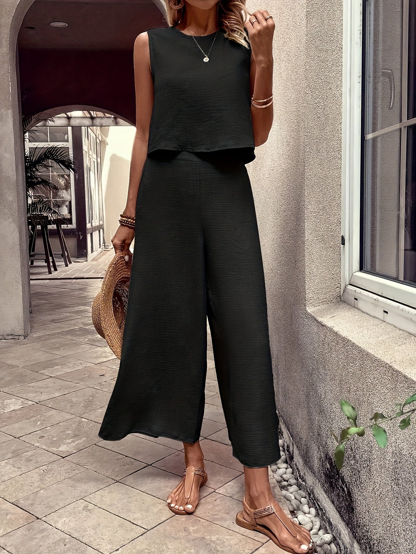 Elegant Solid Color Pantsuits Set, Crew Neck Tank Top & Wide Leg Pants Outfits, Women’s Clothing