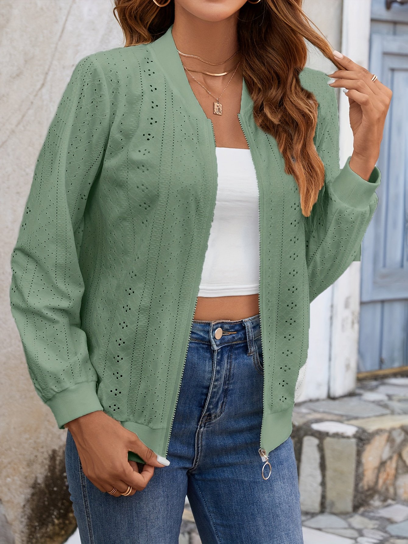 Reviews There are no reviews yet. Be the first to review “Eyelet Zip Up Bomber Jacket, Casual Long Sleeve Versatile Outerwear, Women’s Clothing”Cancel ReplyYour email address will not be published. Required fields are marked *Your rating * Rate… Perfect Good Average Not that bad Very poor Name *Email *Your review * I accept the Privacy Policy Submit