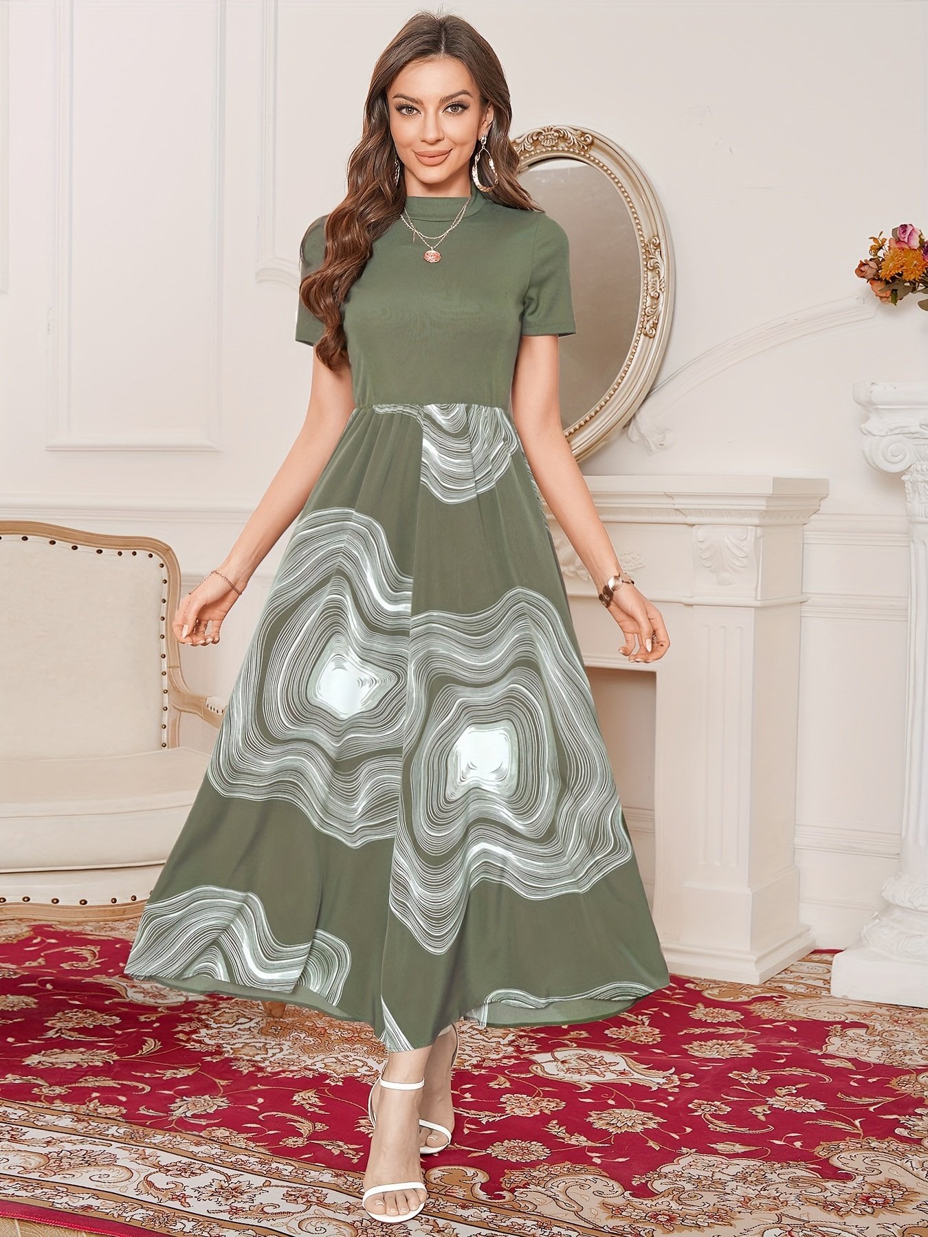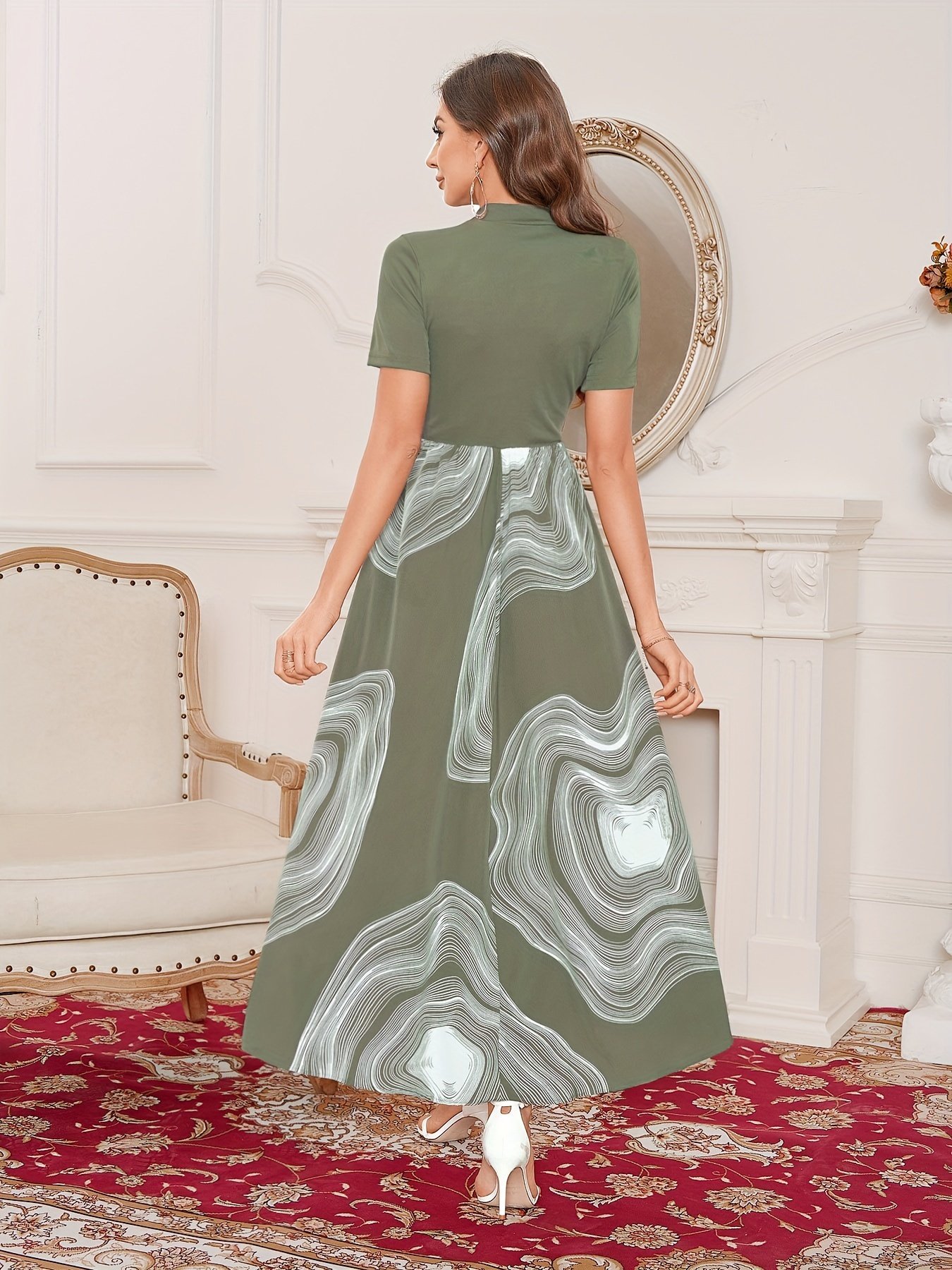 Graphic Print Splicing Aline Dress, Vintage Mock Neck Short Sleeve Dress, Women’s Clothing