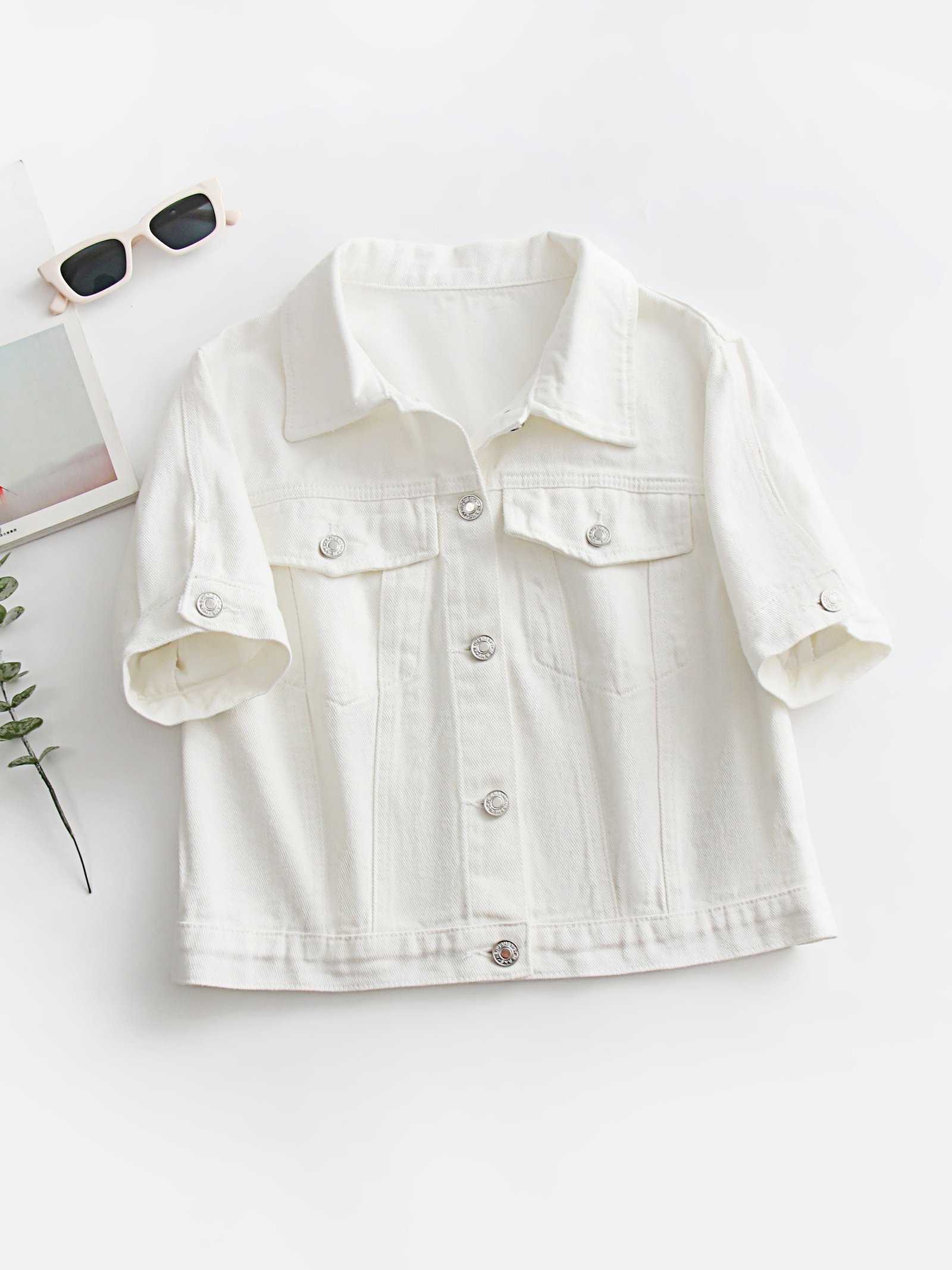 Plain White Short Sleeve Denim Coat, Lapel Single-breasted Flap Pocket Denim Jacket, Women’s Denim Jeans & Clothing