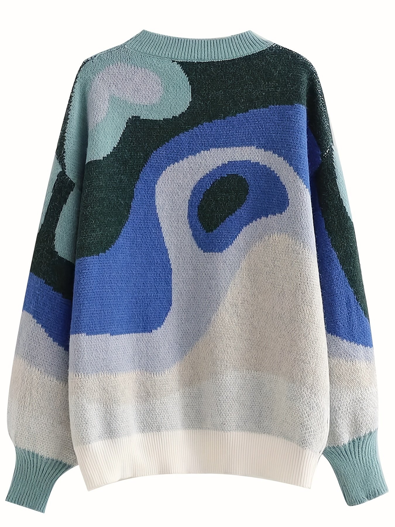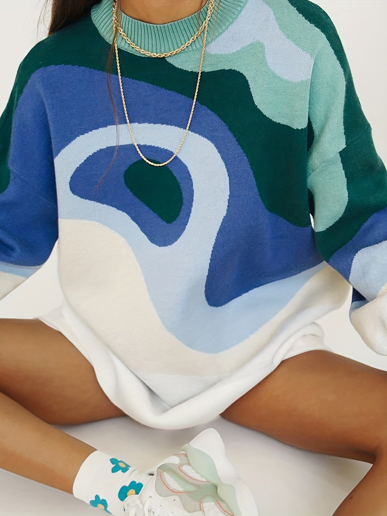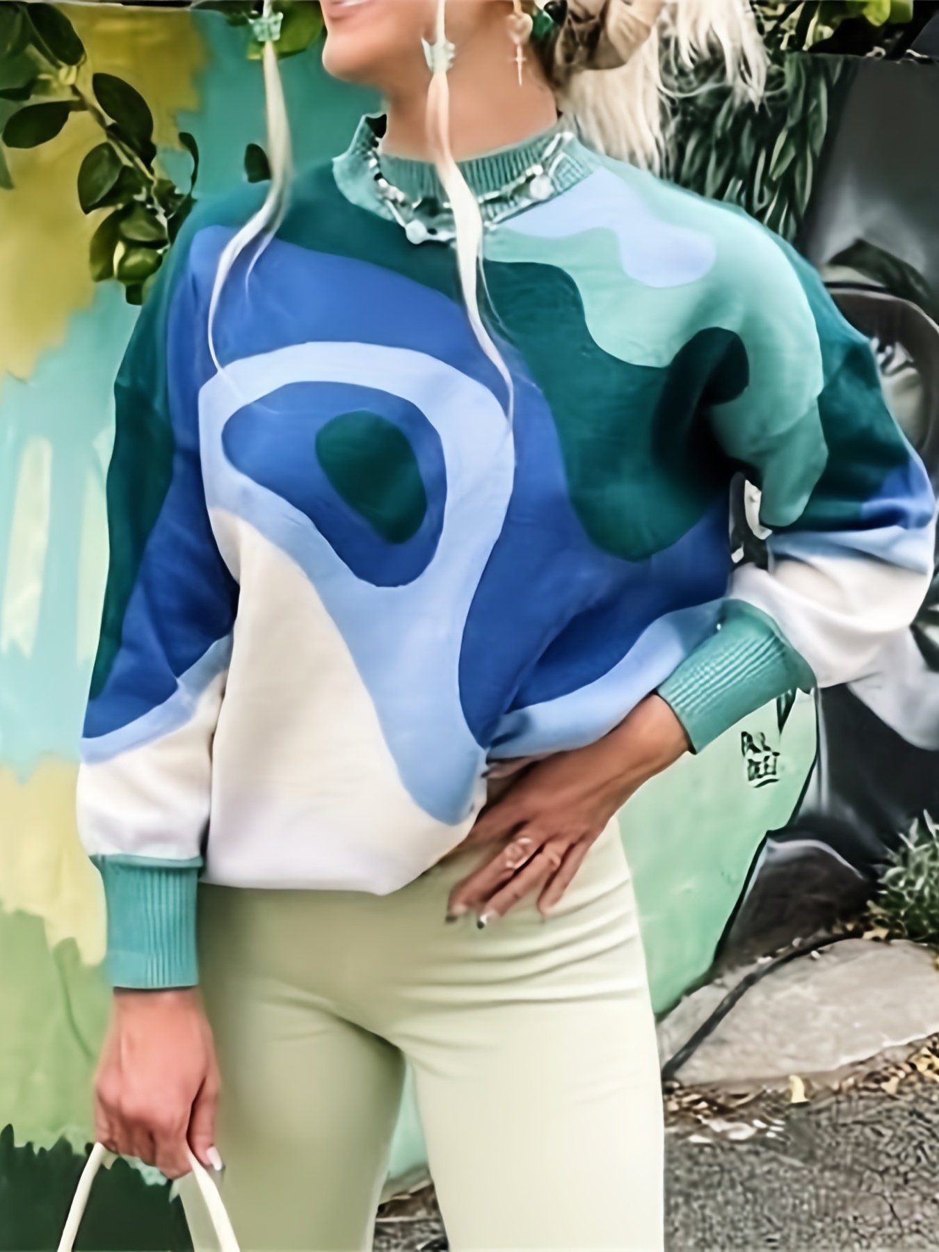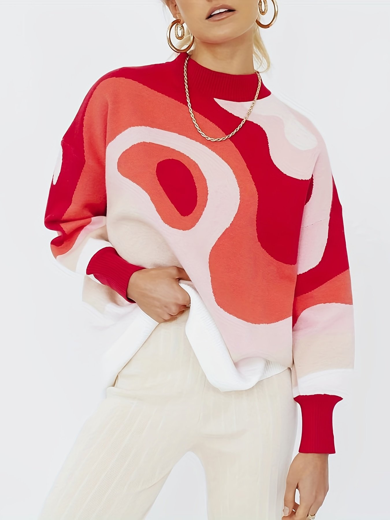 Plus Size Casual Sweater, Women’s Plus Abstract Print Long Sleeve Mock Neck Medium Stretch Pullover Jumper