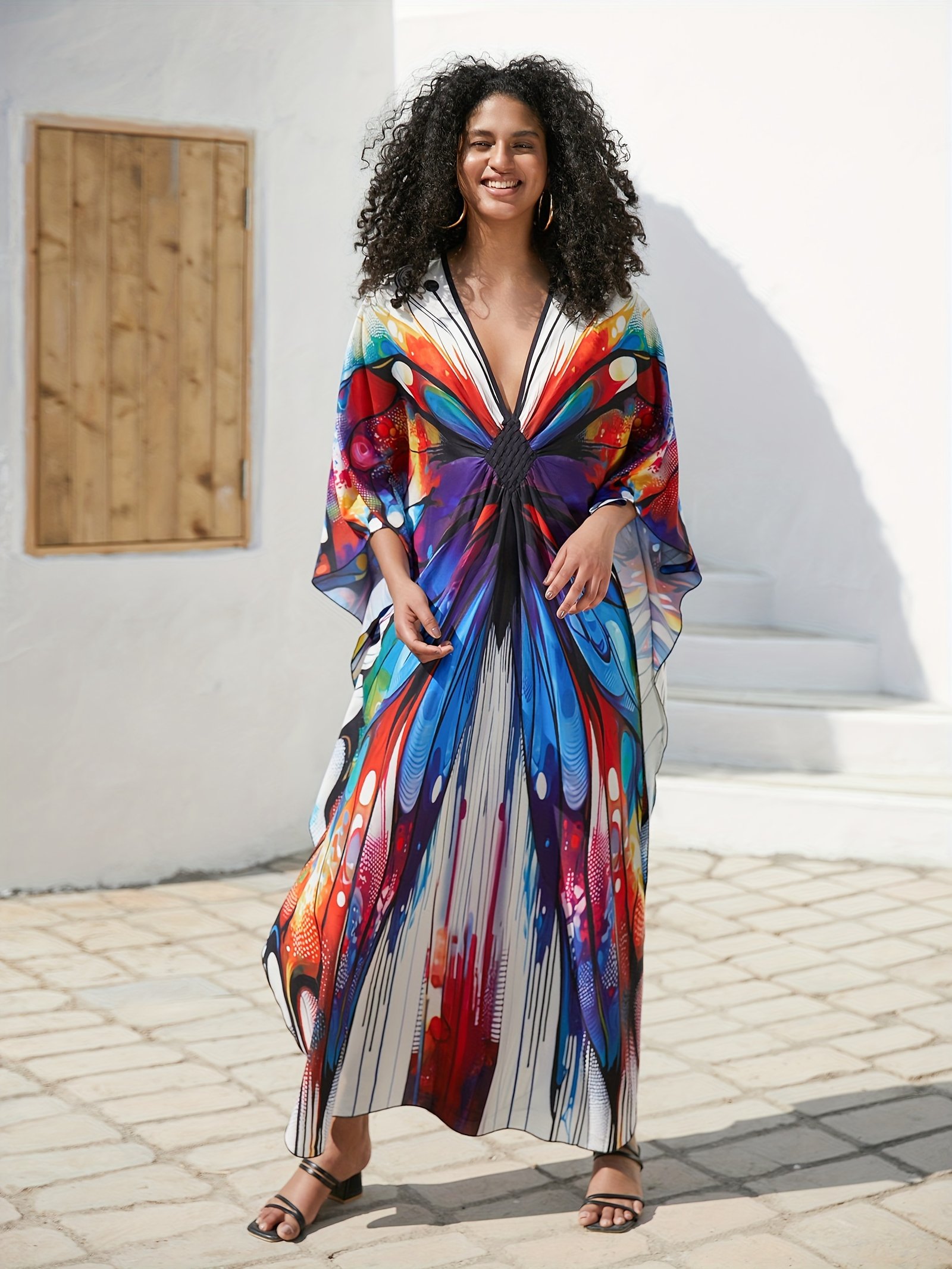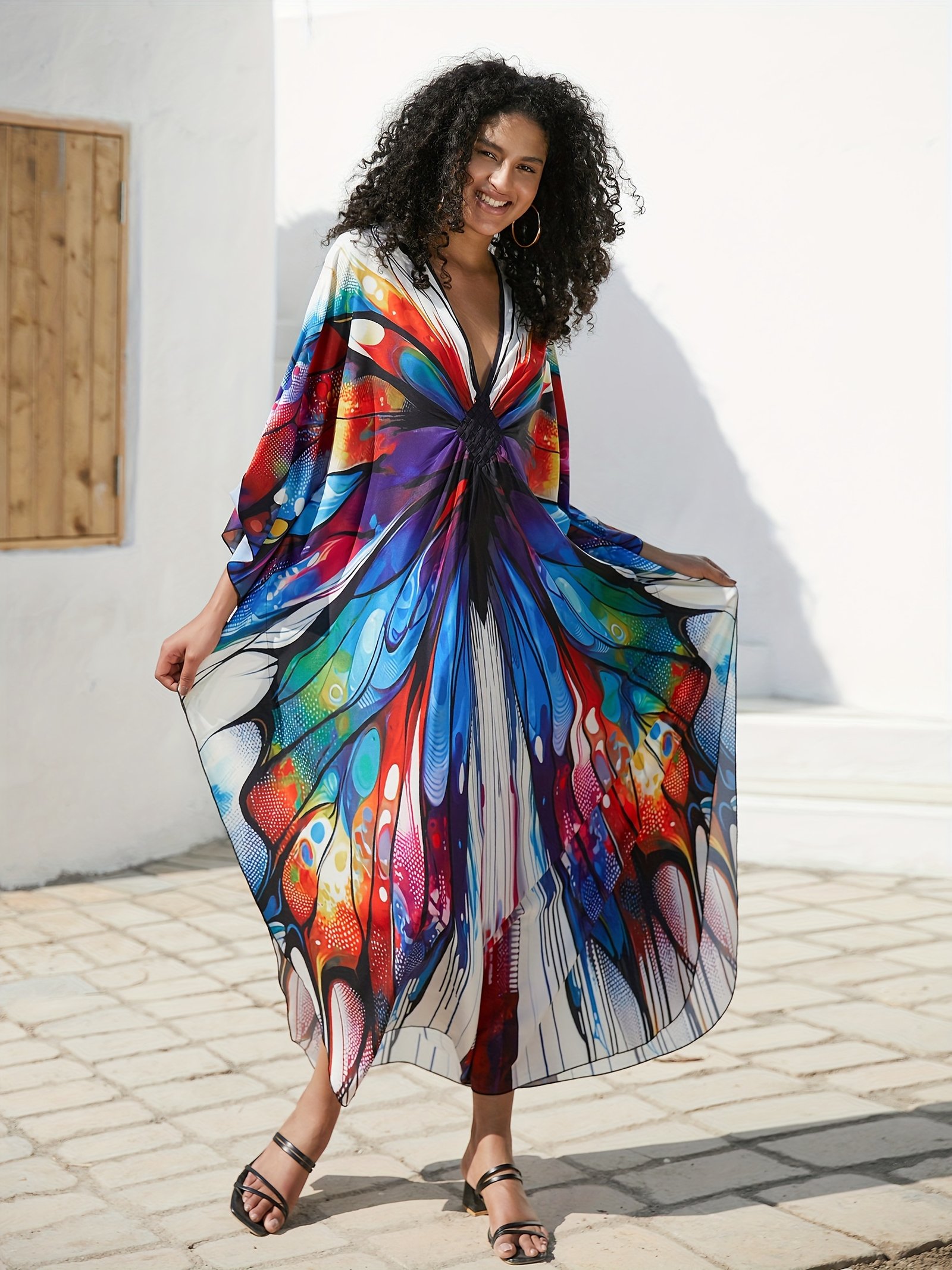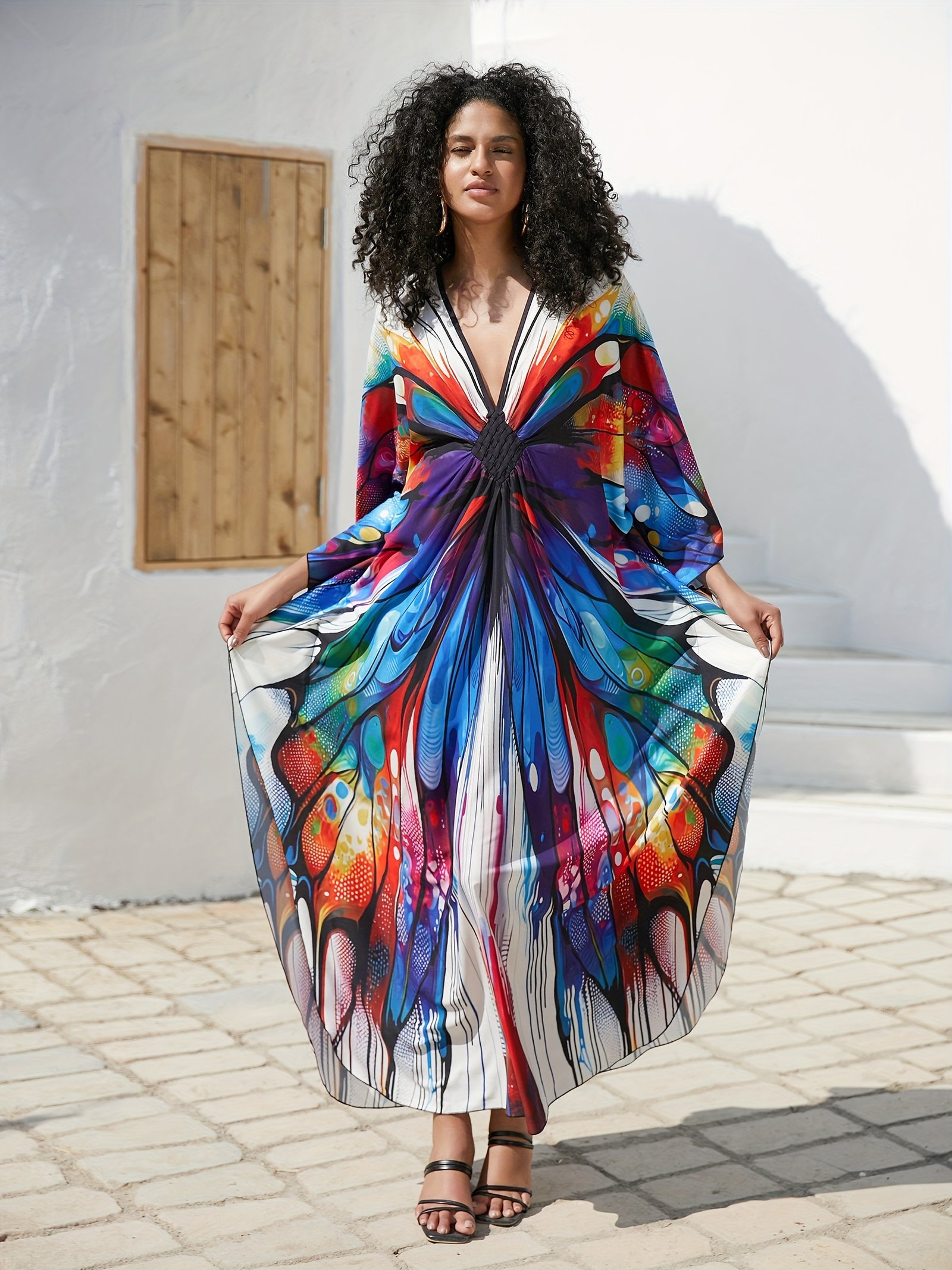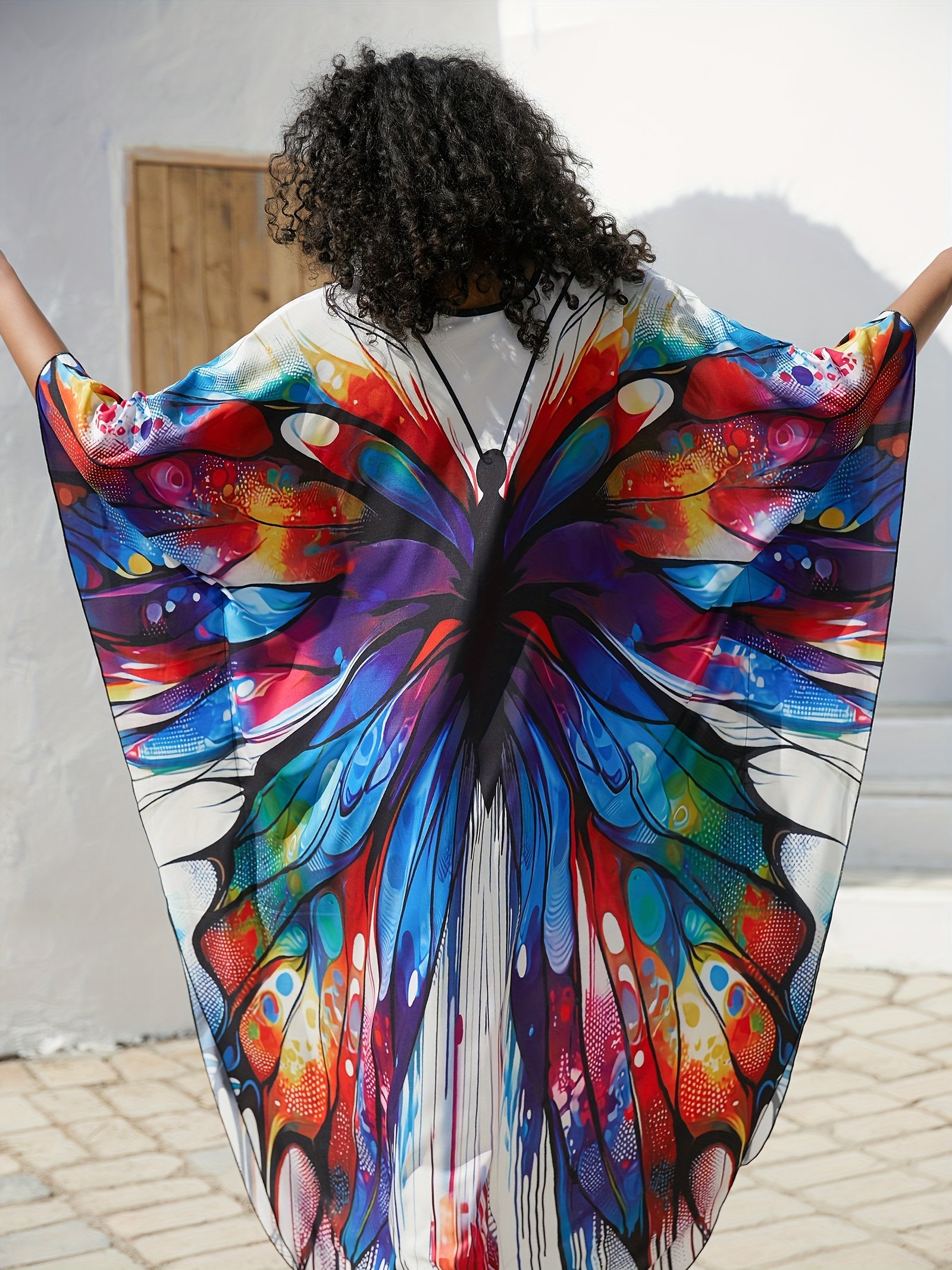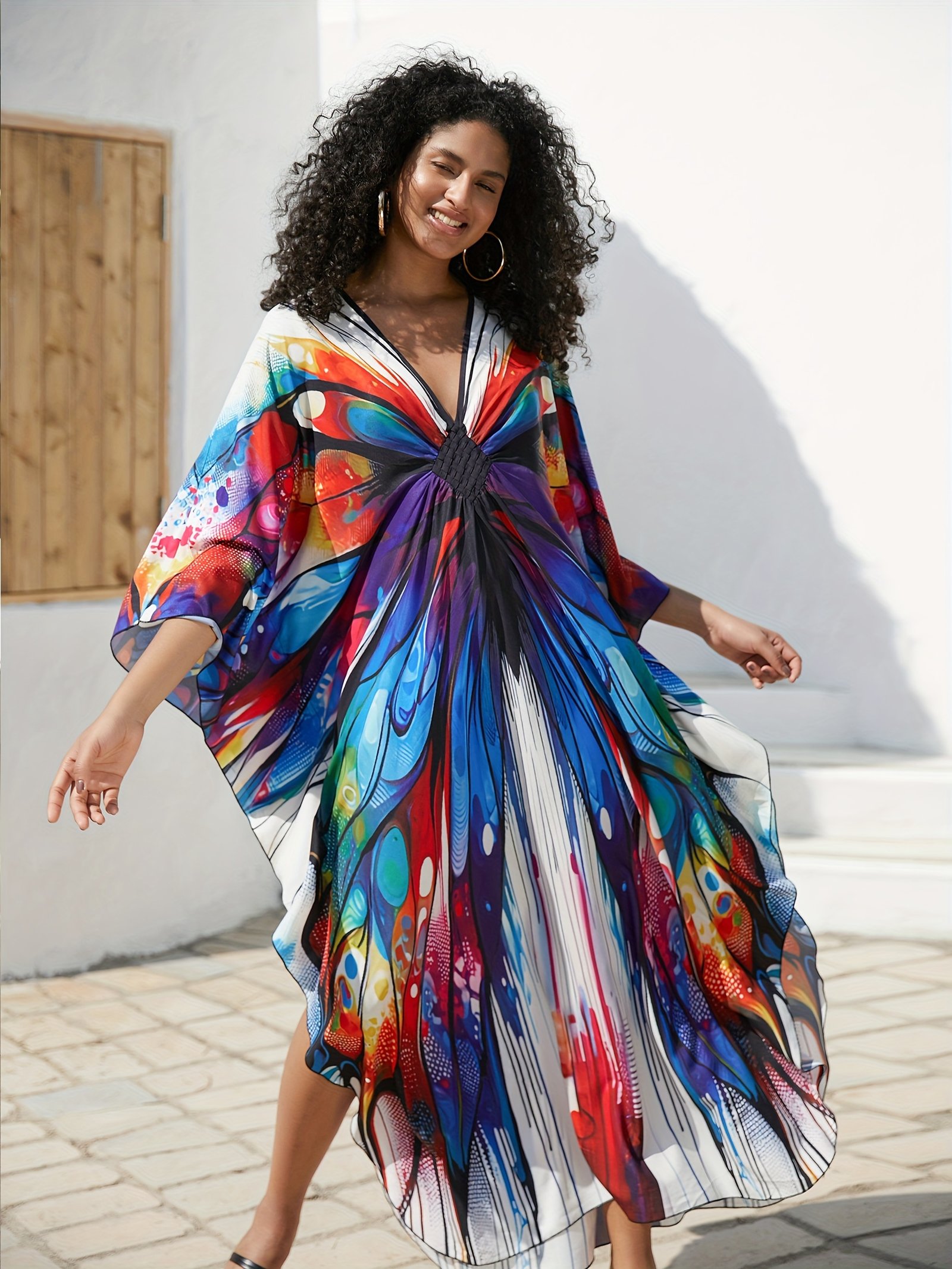 Plus Size Colorful Butterfly Print Slit Dress, Casual Batwing Sleeve Dress For Spring & Summer, Women’s Plus Size Clothing