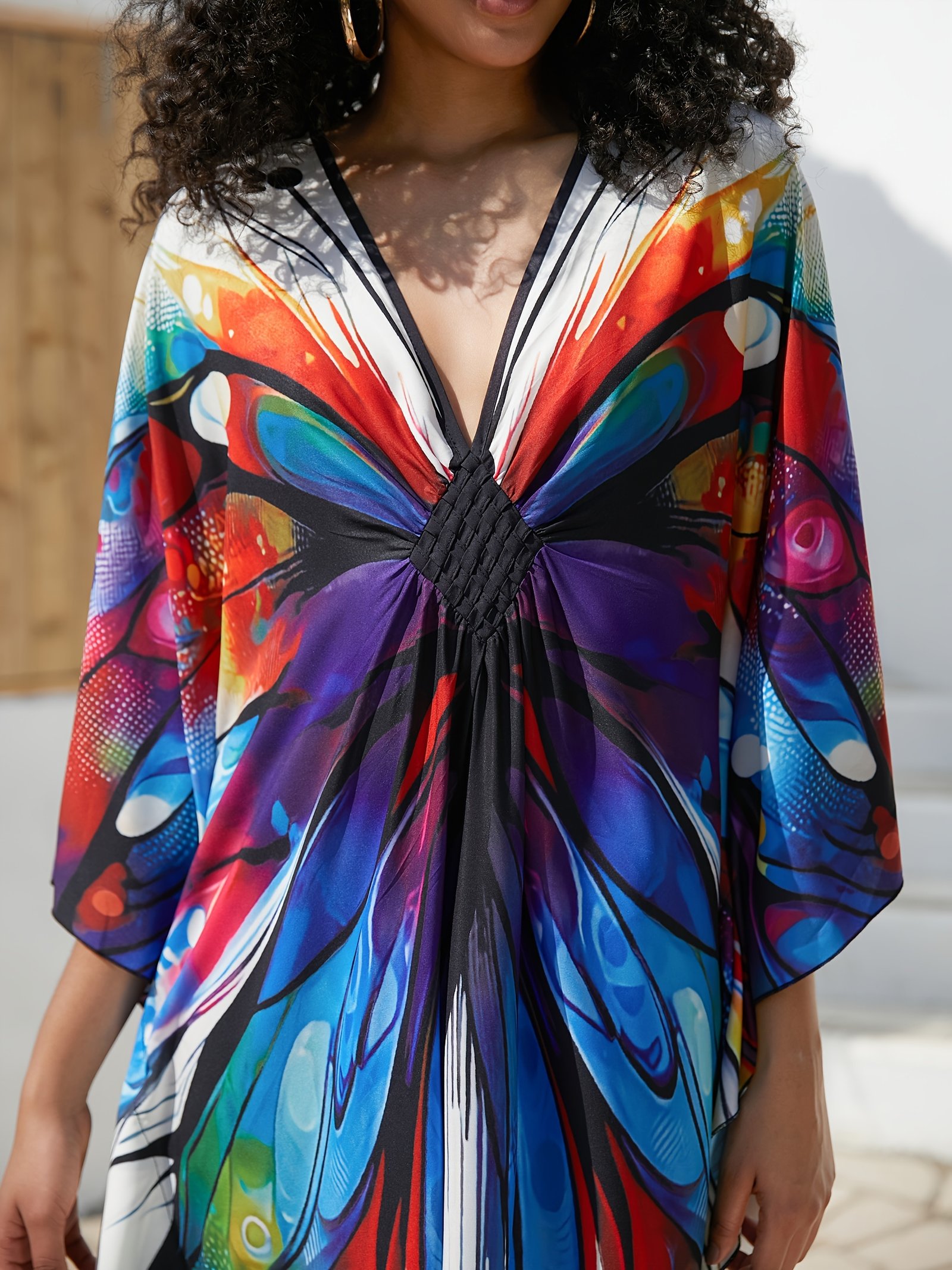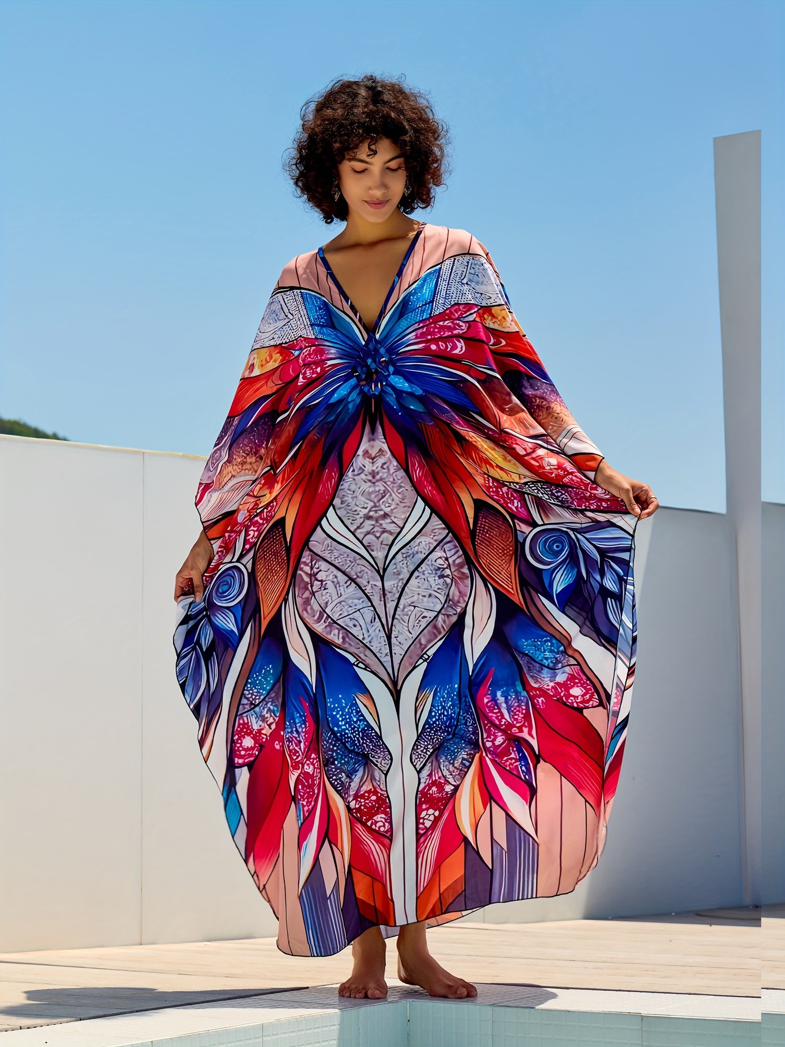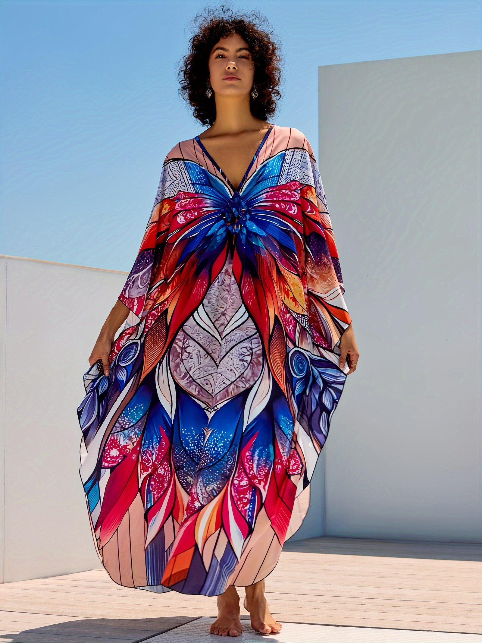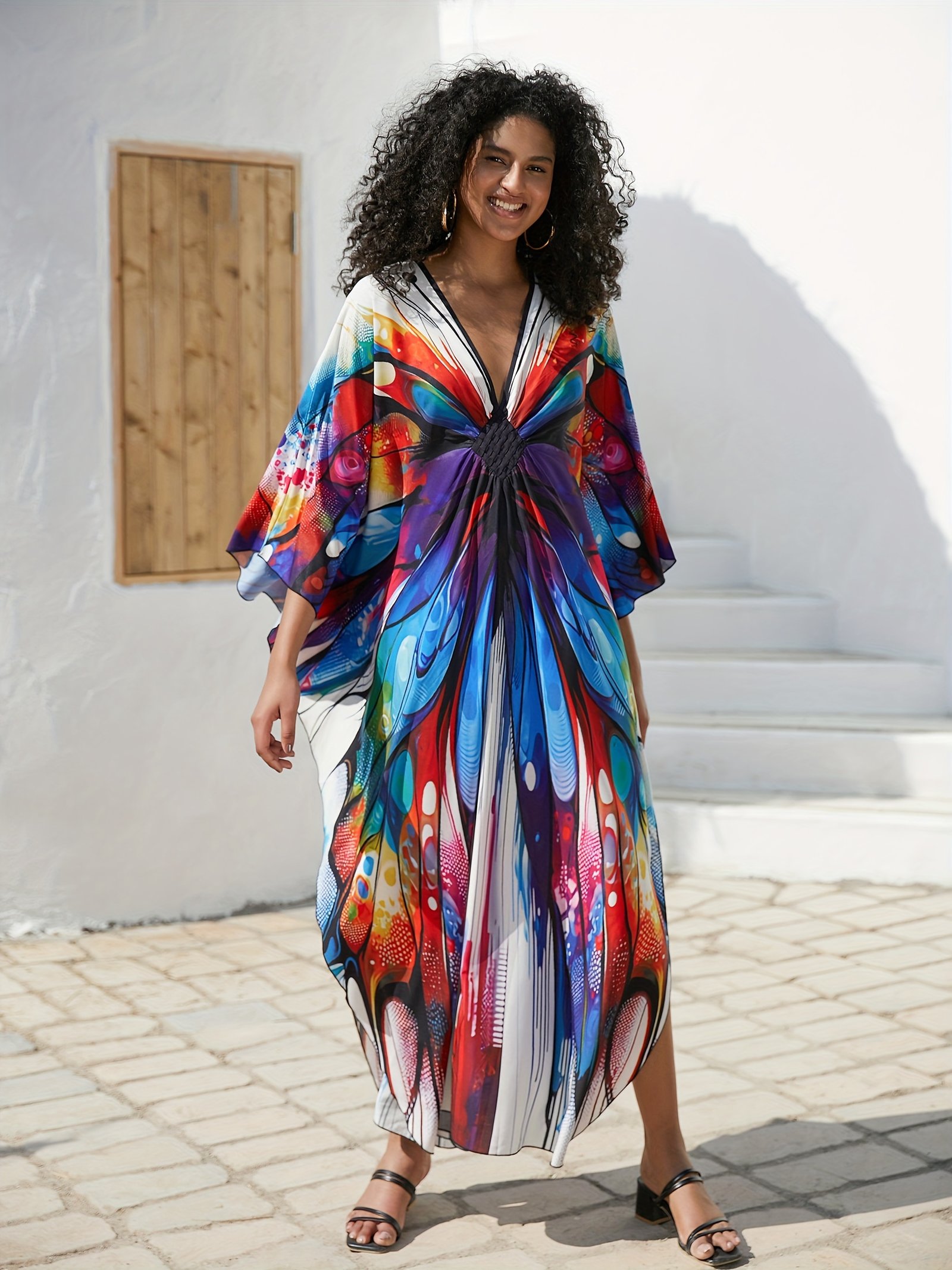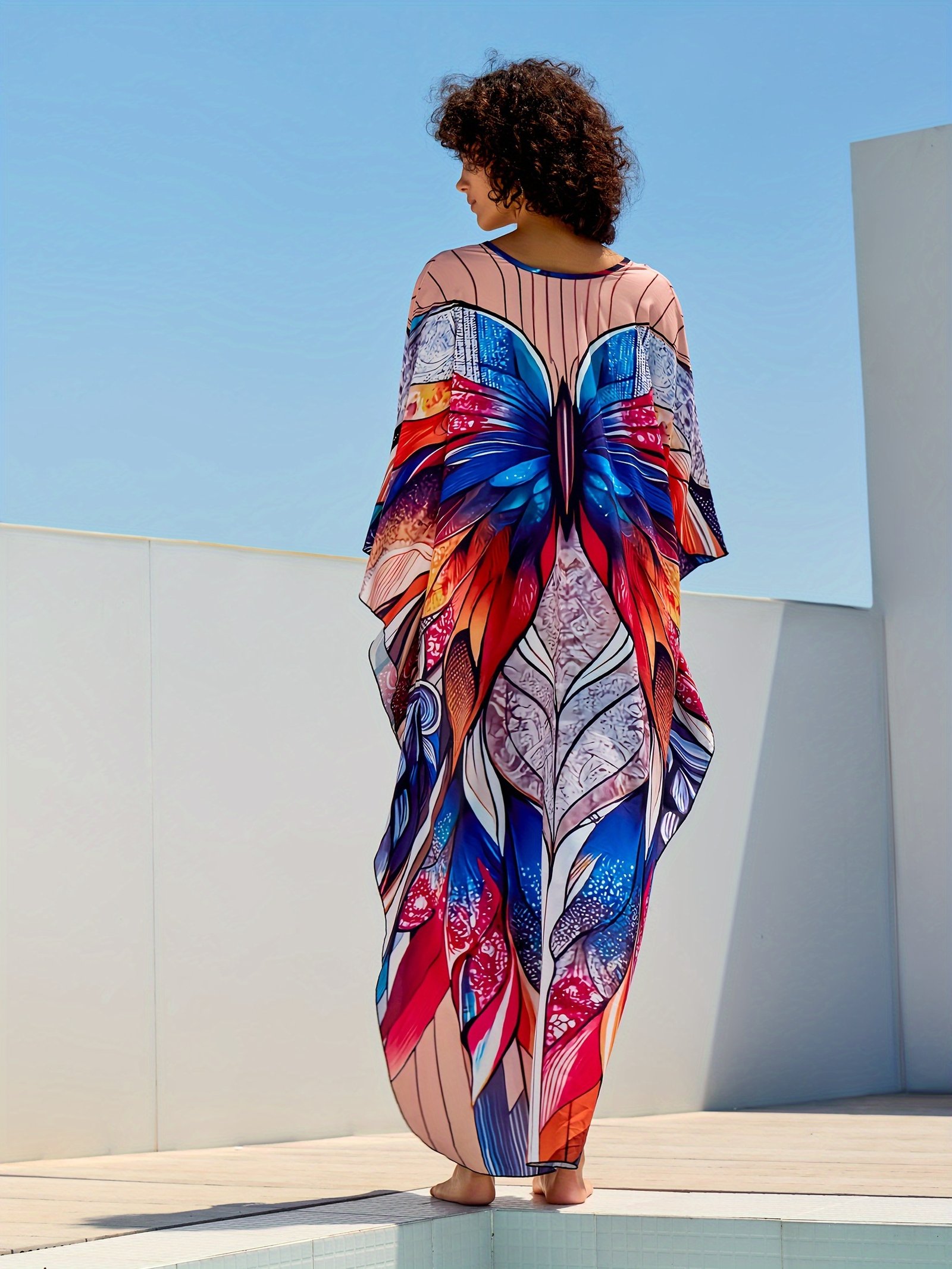 Plus Size Colorful Butterfly Print Slit Dress, Casual Batwing Sleeve Dress For Spring & Summer, Women’s Plus Size Clothing