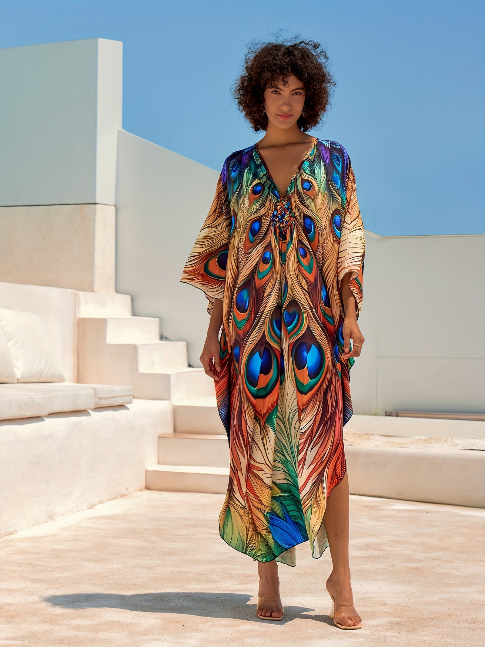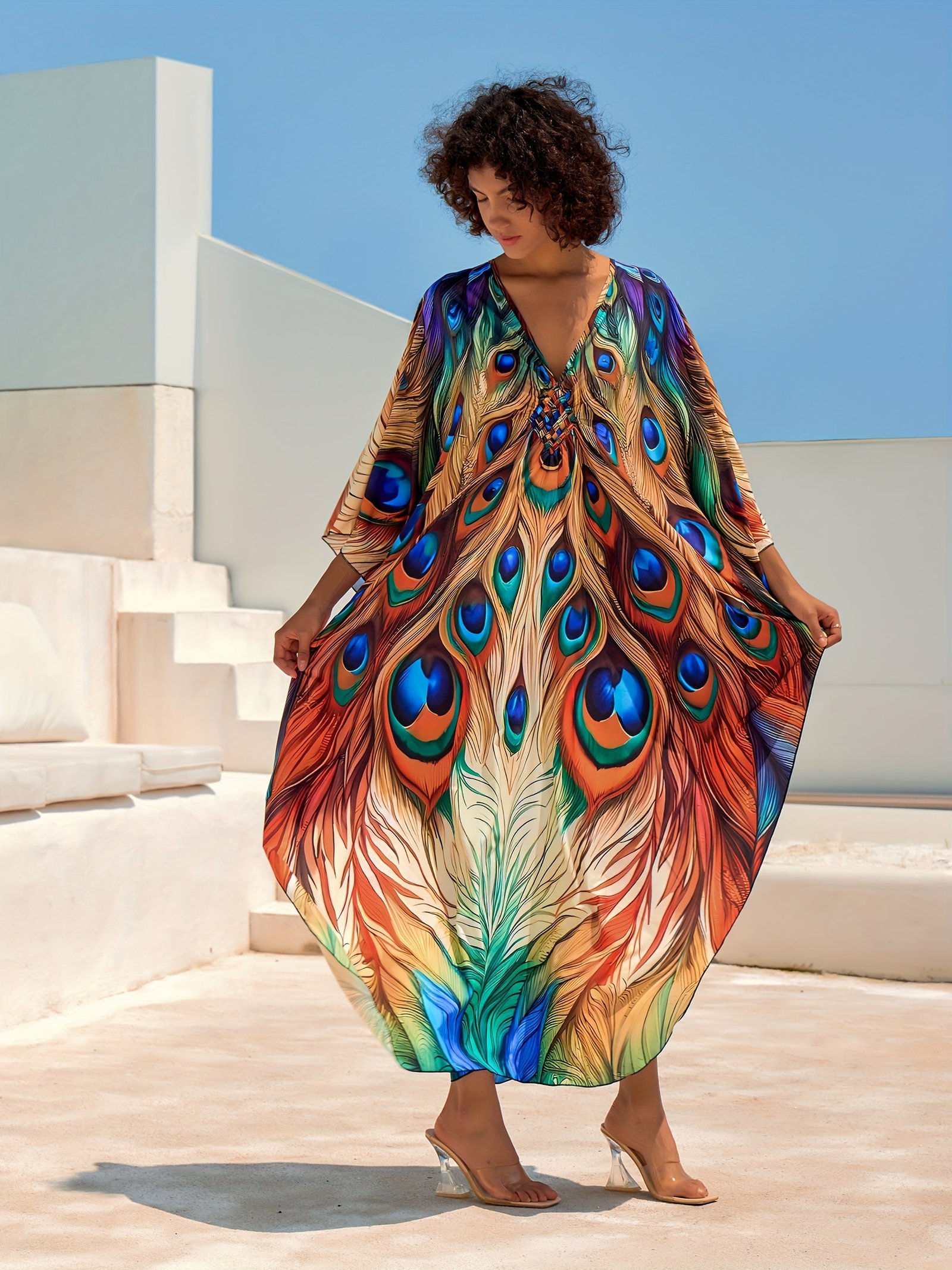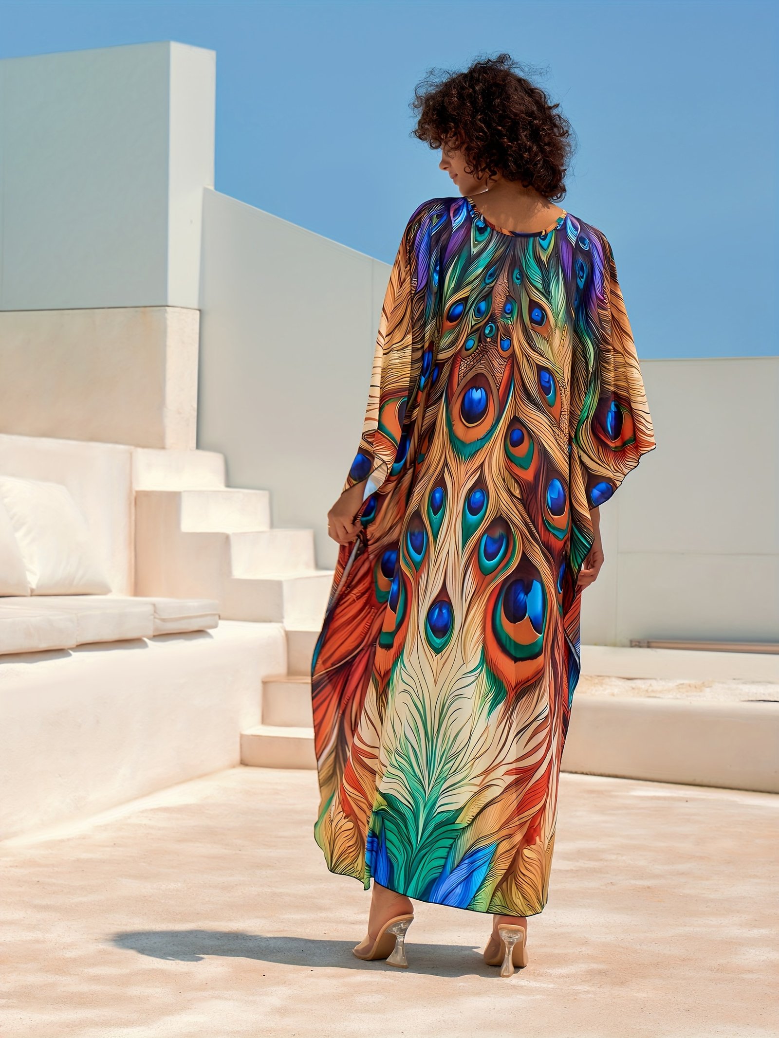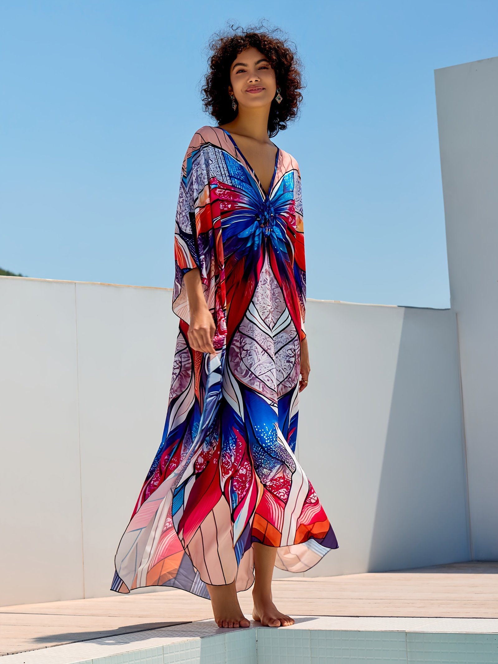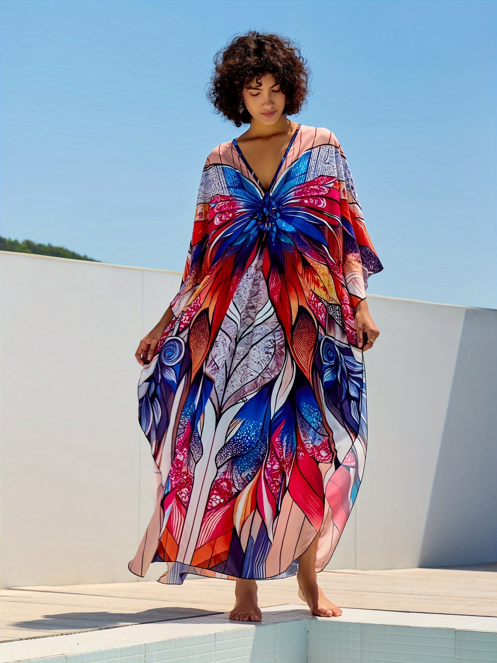Plus Size Colorful Butterfly Print Slit Dress, Casual Batwing Sleeve Dress For Spring & Summer, Women’s Plus Size Clothing