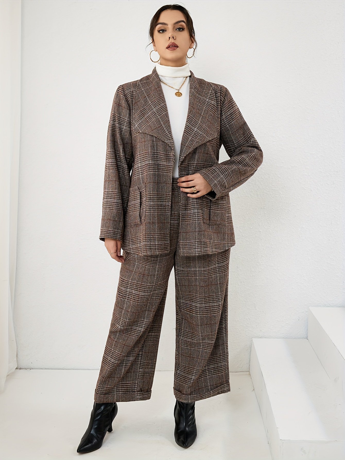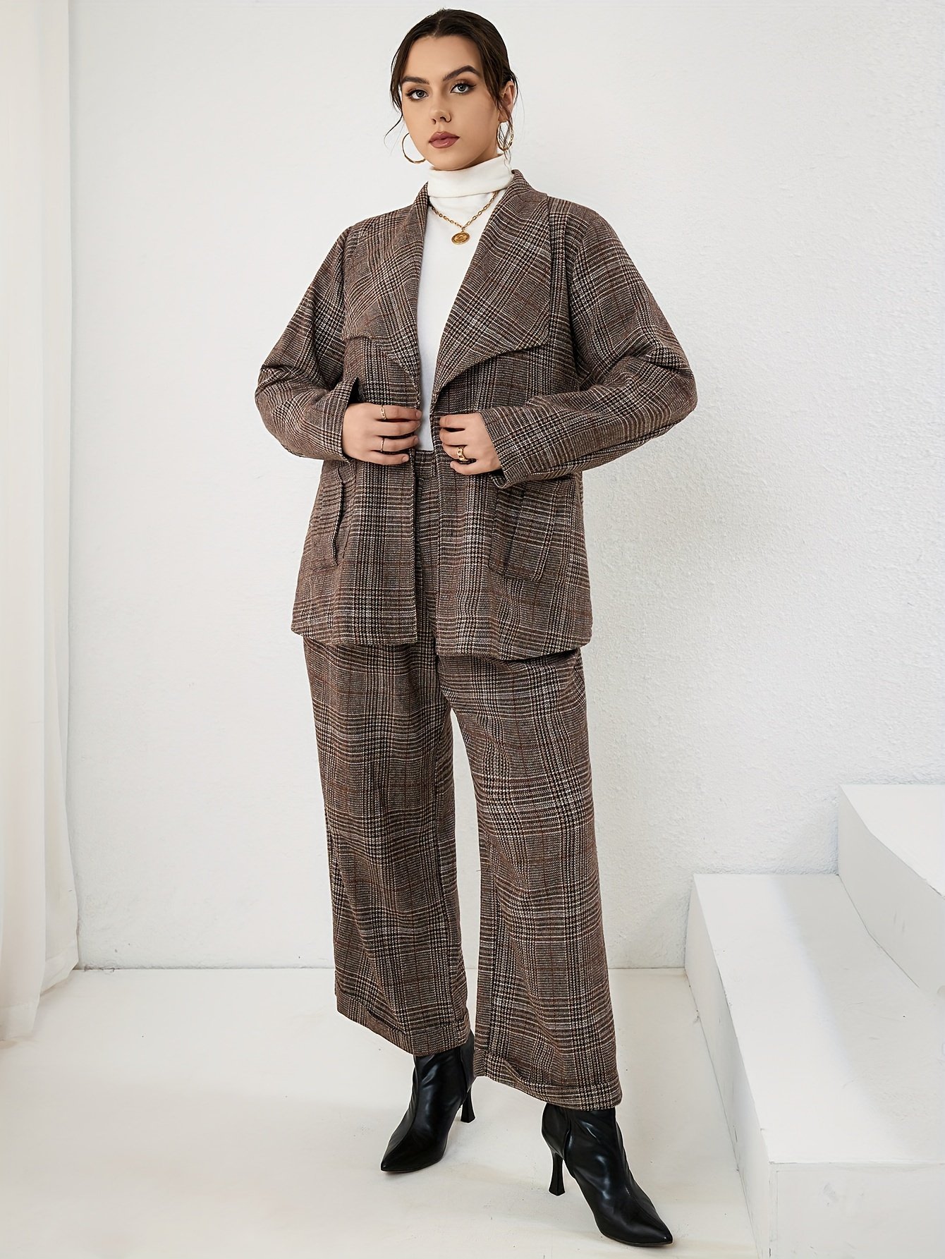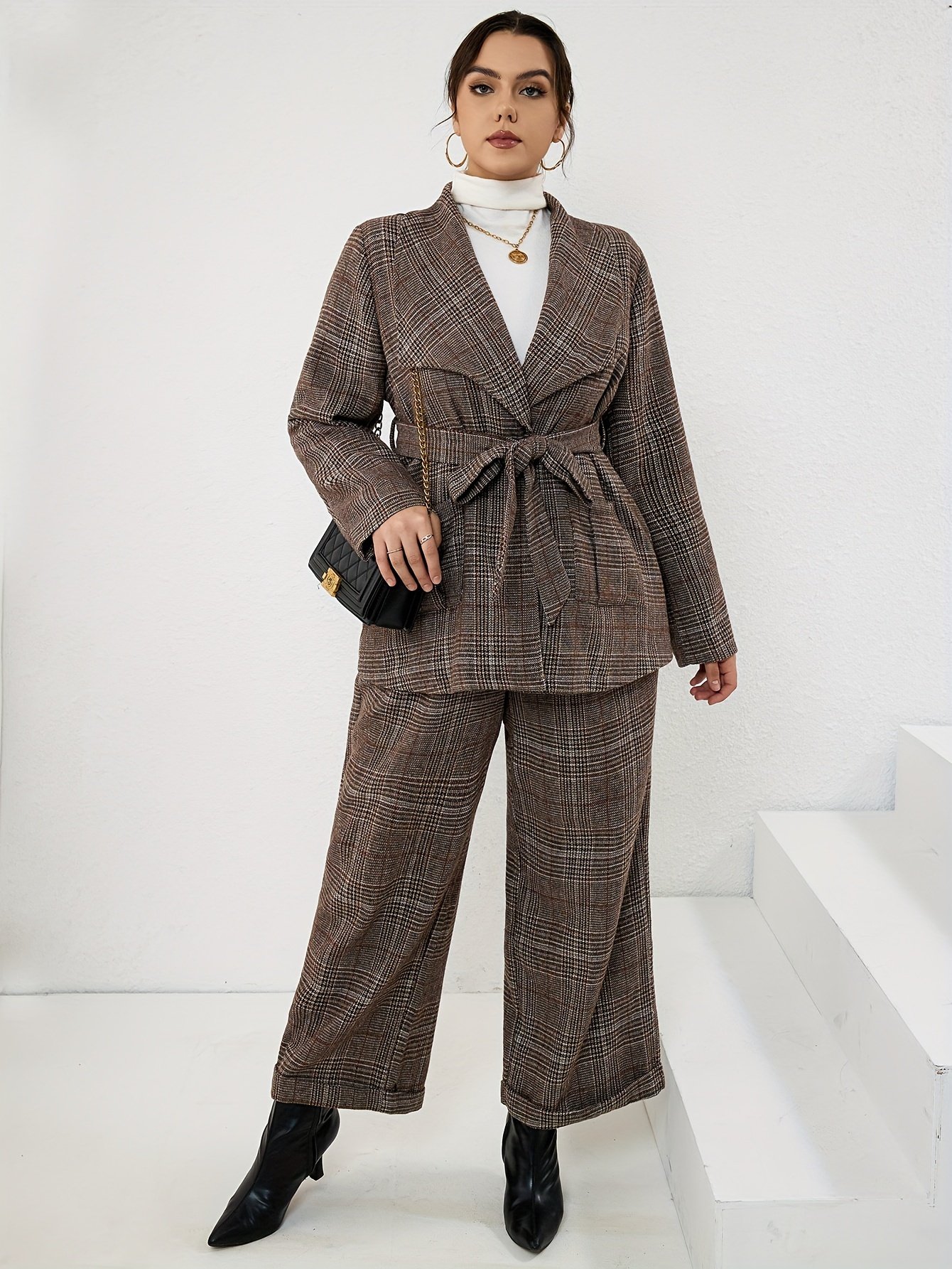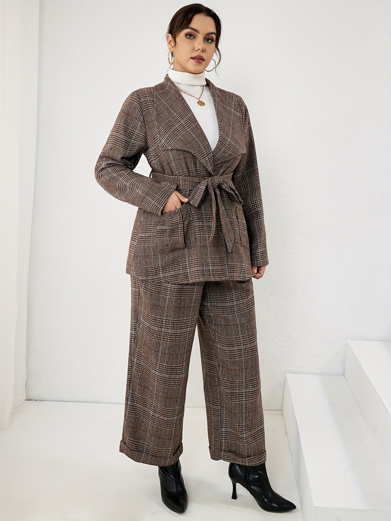 Plus Size Elegant Suit Set, Women’s Plus Plaid Print Long Sleeve Waterfall Collar Belted Blazer & Wide Leg Pants Outfits Two Piece Set