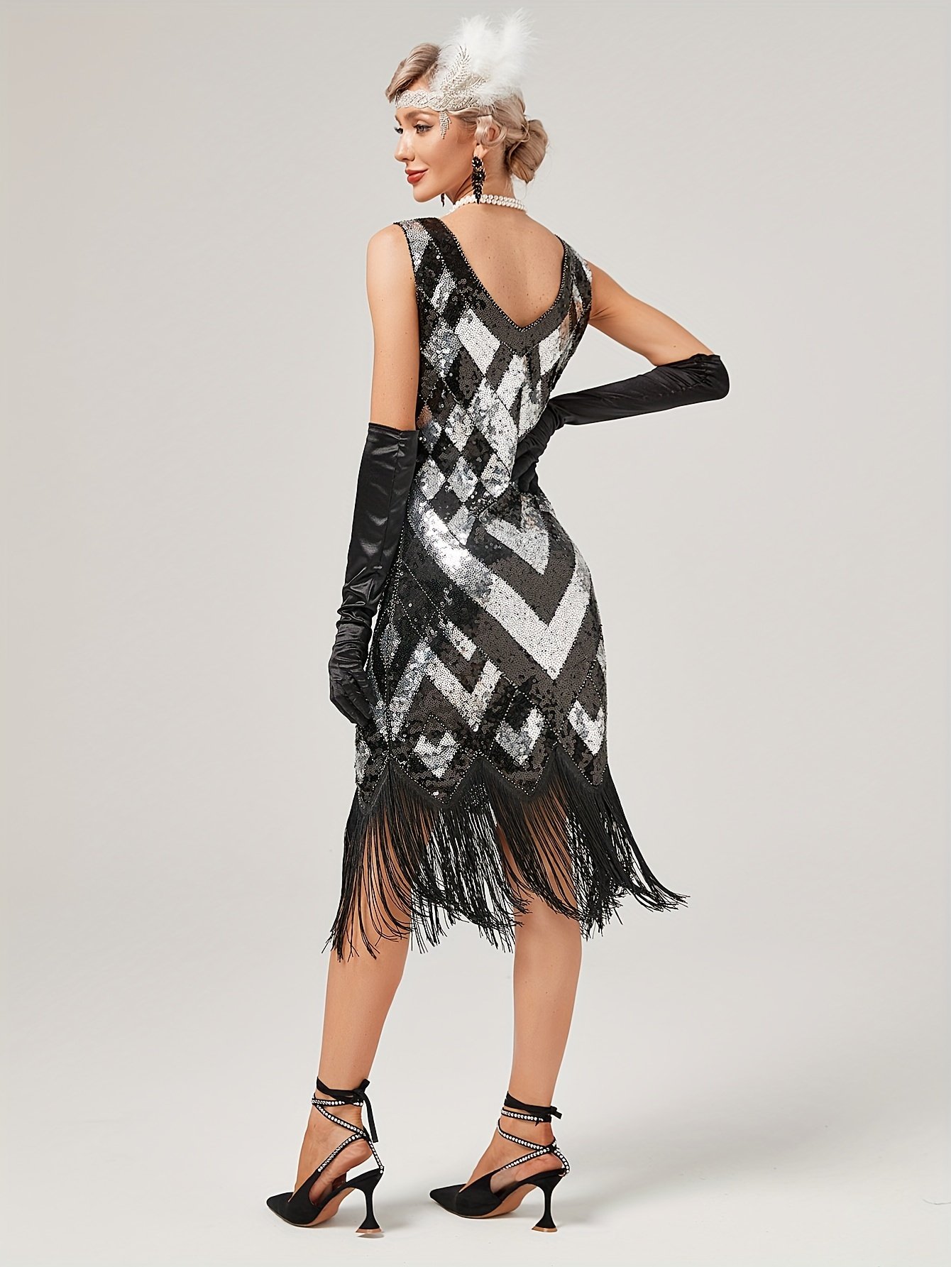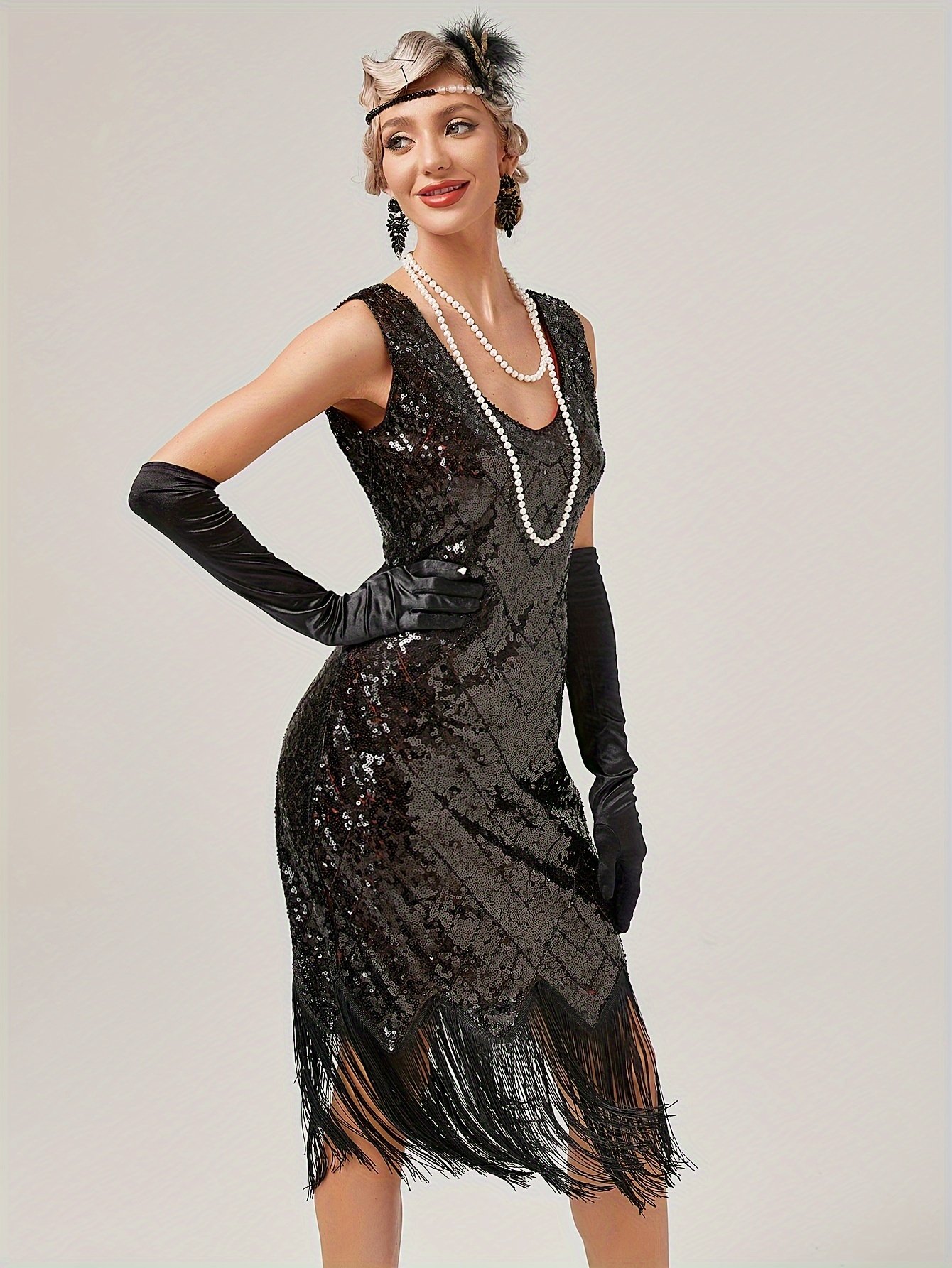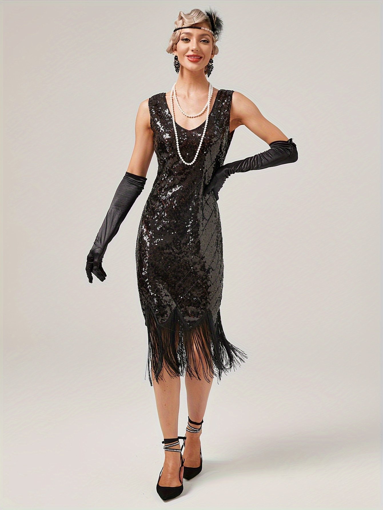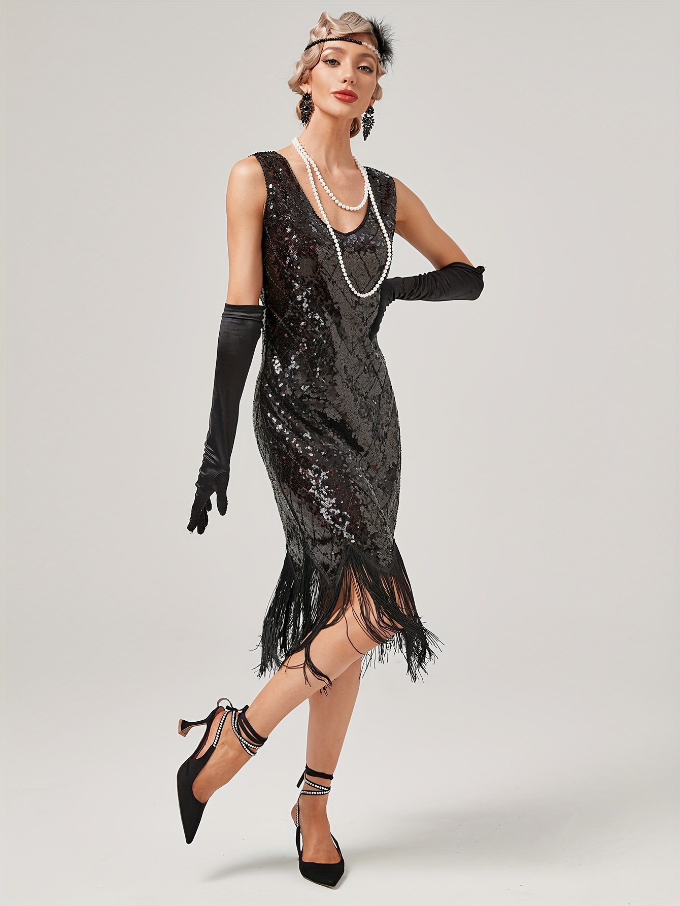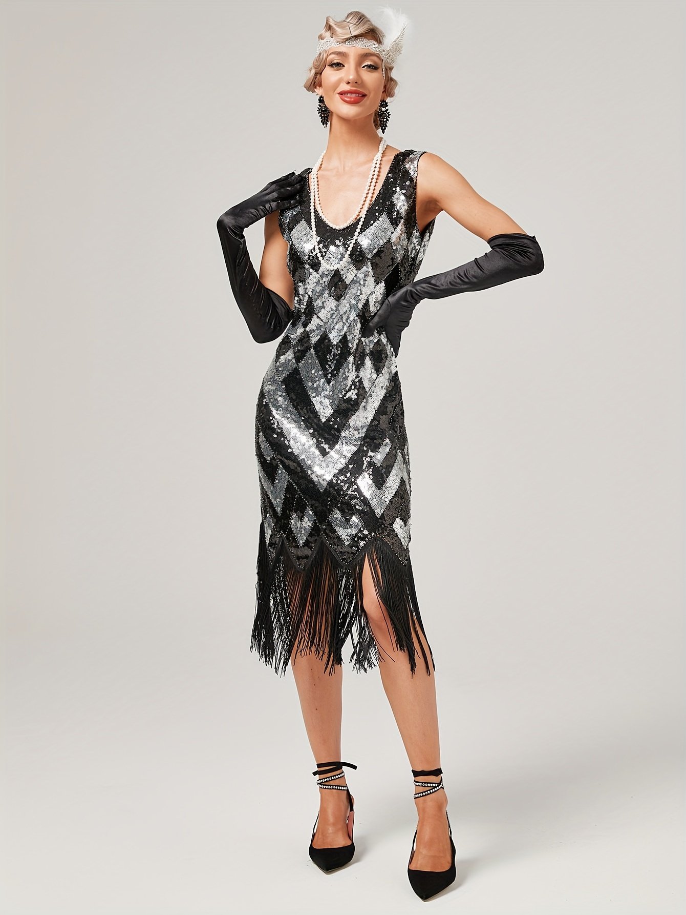 Sequined Tassel Hem Dress, Vintage Plunging Neck Sleeveless Backless Sheath Dress, Women’s Clothing