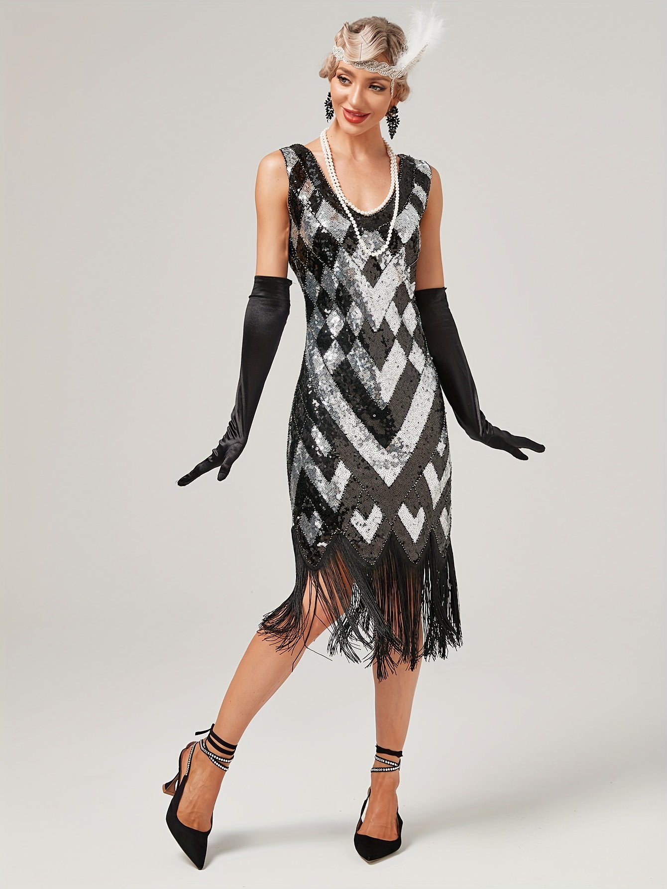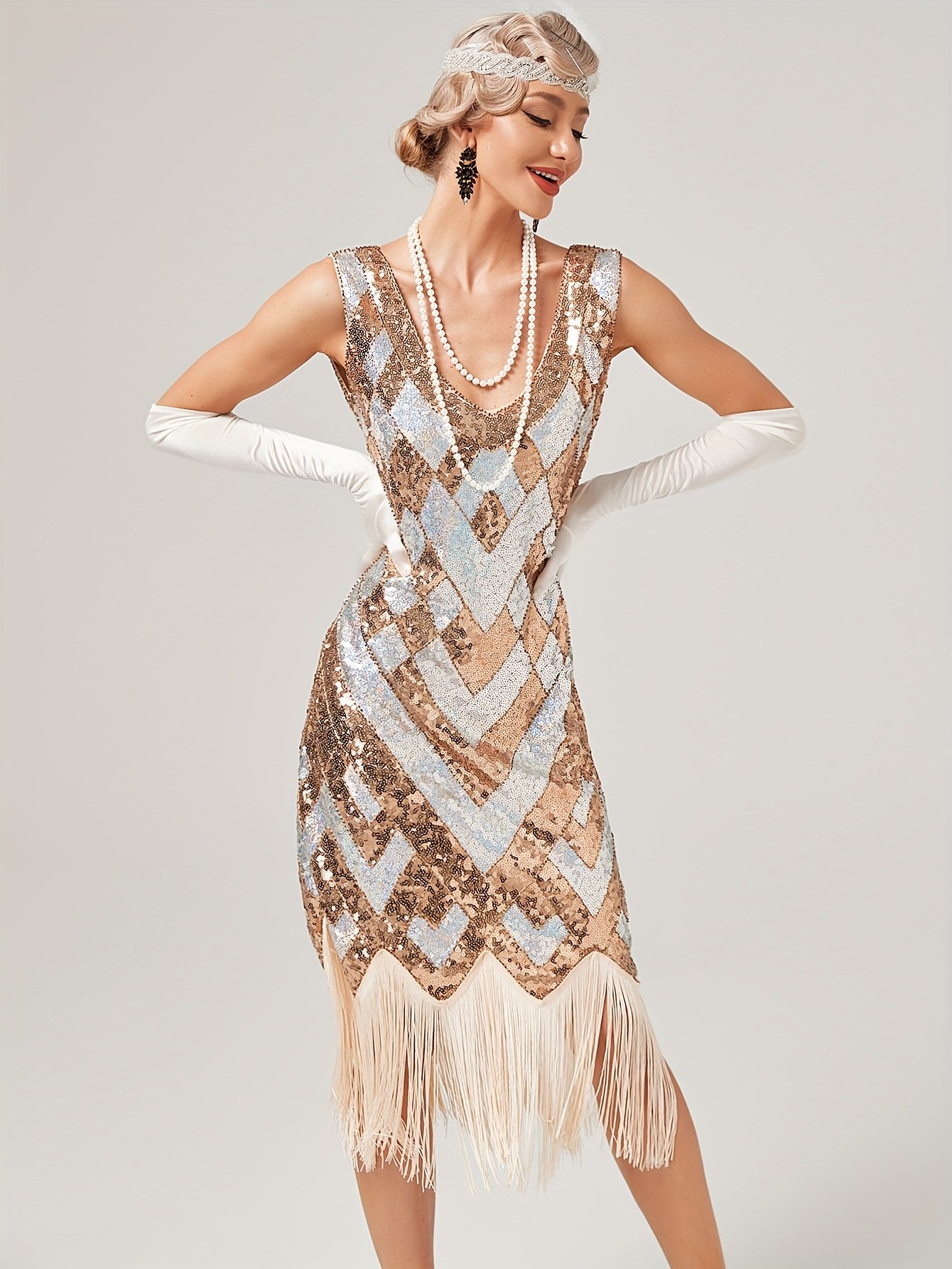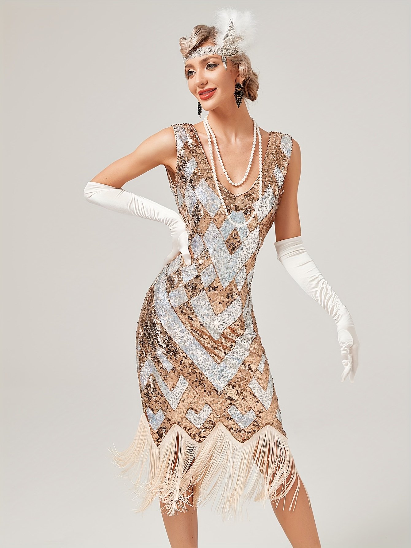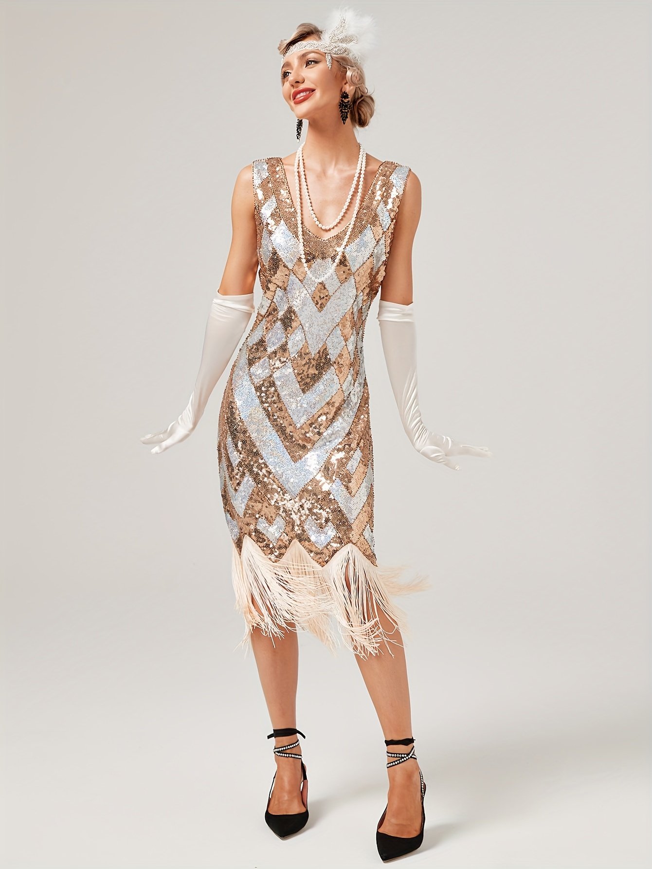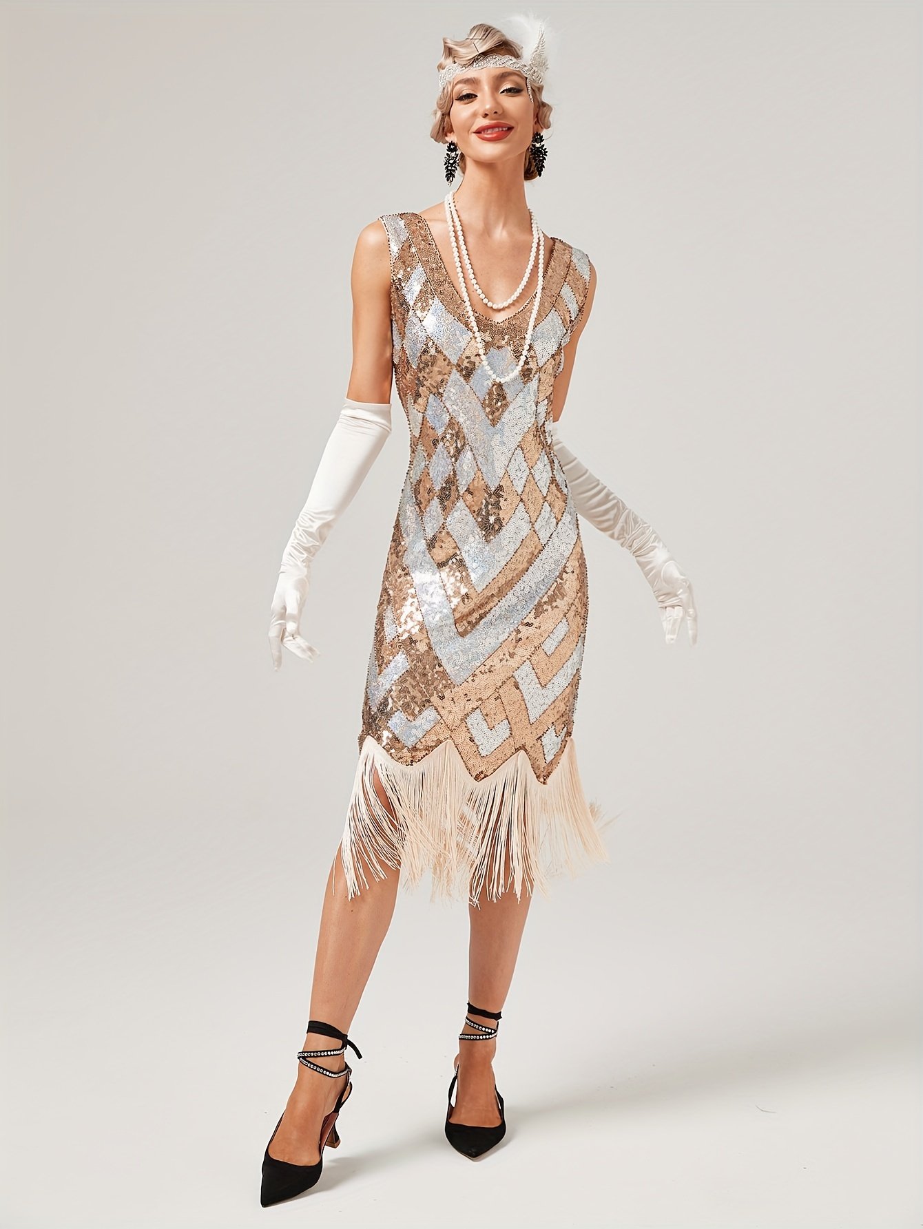 Sequined Tassel Hem Dress, Vintage Plunging Neck Sleeveless Backless Sheath Dress, Women’s Clothing