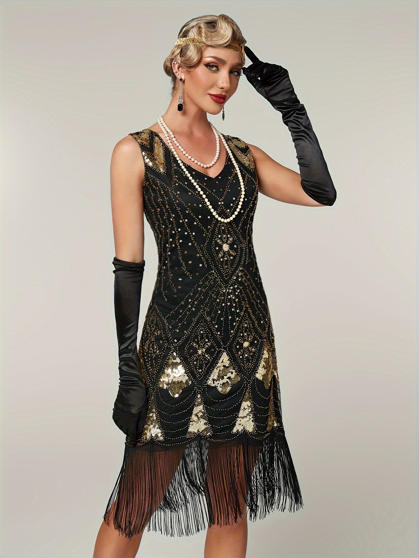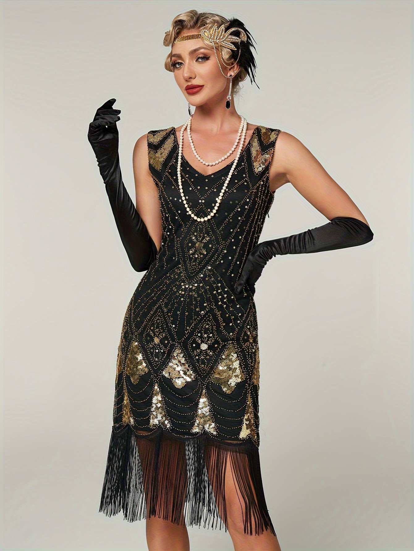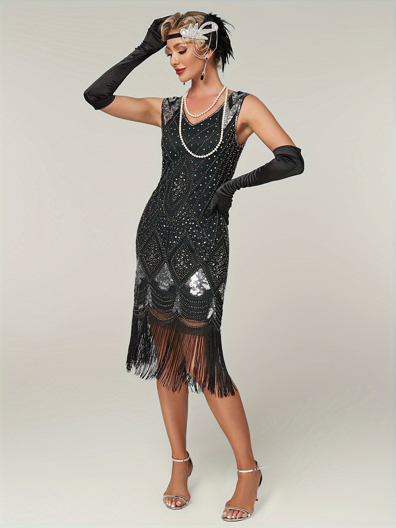 Be the first to review “Sparkling Sequin V Neck Dress, Elegant Sleeveless Sheath Fringe Hem Dance Dress For Party & Club, Women’s Clothing”